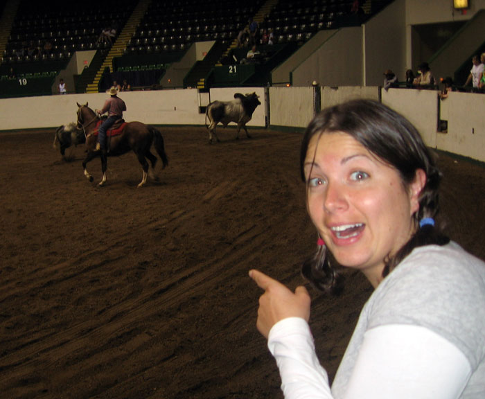 In 2006, Liz asked me to go to the fair with her so we could see her high school friend in the rodeo. I’ve never seen anyone so excited! Liz flipped out when the big old bull hopped through a ring of fire. Watching her react was far more entertaining than the rodeo itself. Here she is long after the rodeo had ended, still trying to get a closer look at the horses.