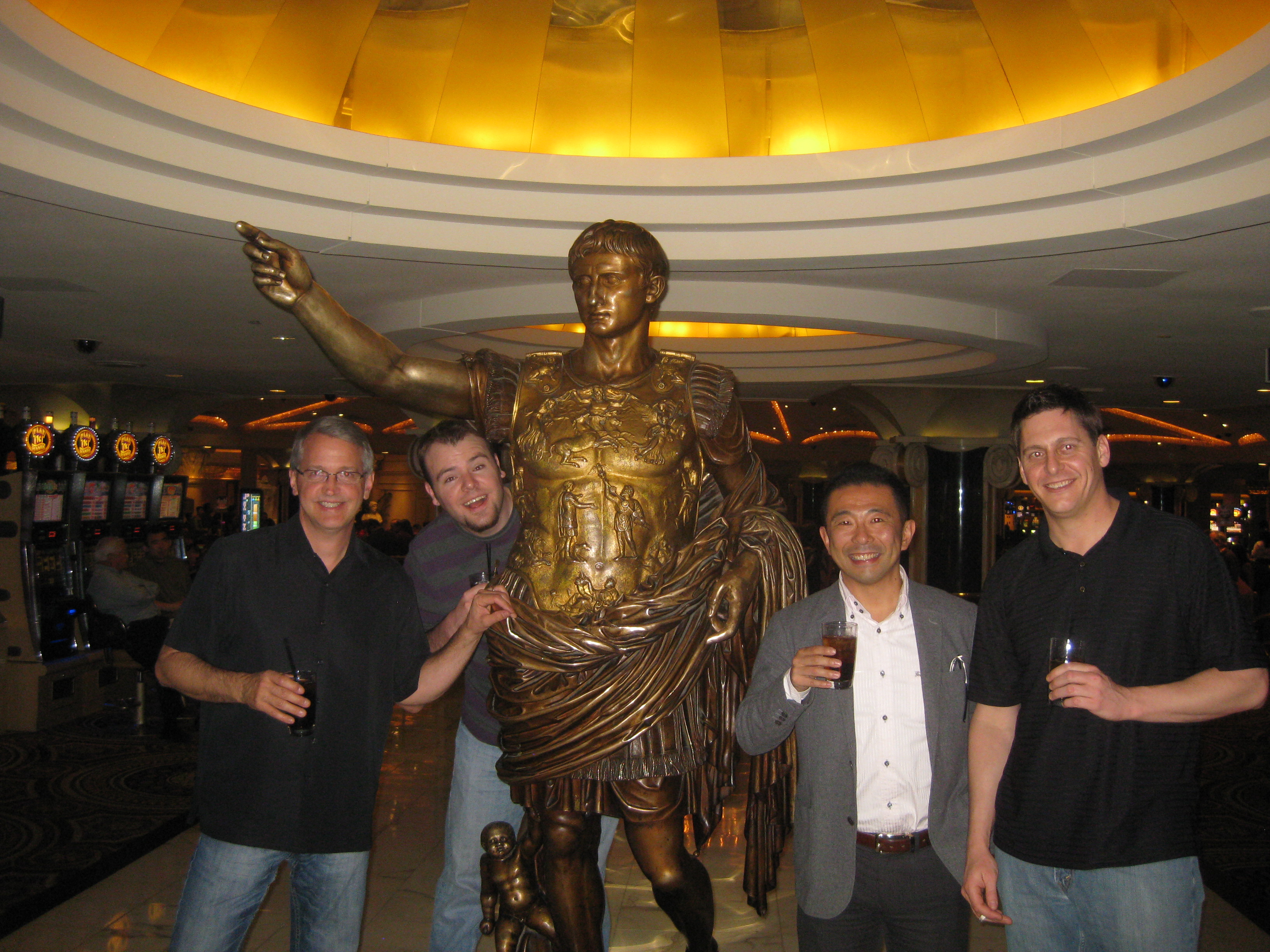 Tuesday night we took a new Japanese business partner out for dinner at the Top of the World revolving restaurant at the Stratosphere, and after dinner a few of us did the Big Shot ride on top of the building. Tuesday was our one big night out on the town with drinks flowing till the wee hours. We hit up the Rhumbar, Cleopatra, and a few other spots before stopping at Bill’s Gamblin’ Hall and Saloon where they had something for everyone–karaoke for me and craps for the others. I tipped my way to the front of the singing line and performed a dazzling rendition of Meat Loaf’s “All Revved Up with No Place to Go” at 1:30am. At 2:30, I was bored watching the guys at the craps table and abandoned them and went to bed. I heard they didn’t get back to the hotel till 6:30, and then were up again at 7:45 for breakfast.