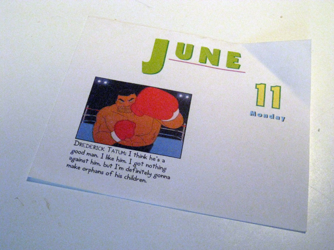 5. Simpsons Desktop Calendar, June 11: I don’t know what year this is from, but this is obviously the June 11 page of my Simpsons desk calendar. It features famed Springfield boxer Drederick Tatum exclaiming “I think he’s a good man. I like him. I got nothing against him. But I’m definitely gonna make orphans of his children.” Why did I save this? That episode or scene means nothing to me. That date means nothing to me. Why did this page get saved while the rest of the year was thrown out? And why the hell do I still have it?