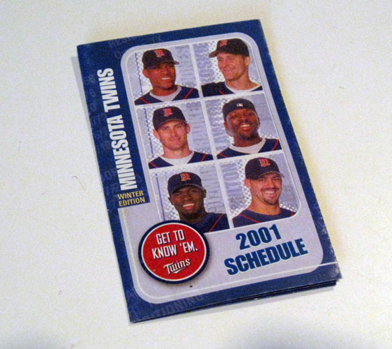 4. 2001 Minnesota Twins Winter Pocket Schedule: This schedule came out immediately following the 2000 season, the Twins’ eighth straight dreadful year. The slogan of “Get to Know ‘Em” was quite appropriate as the team was filled with no-name rookies like Cristian Guzman and Eric Milton, pictured at bottom. This early edition of the 2001 team schedule has been with me since, just in case I can’t find out on baseball-reference.com who the Twins played on a certain date. But, as fate would have it, 2001 was the year the Twins finally started turning around and had a winning record.