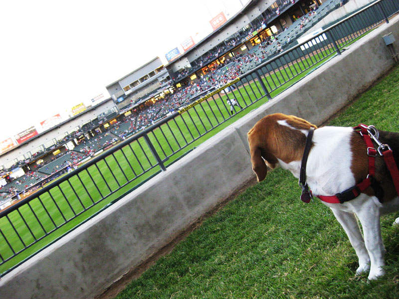 Baxter made his pro baseball debut Wednesday night at the Round Rock Express “Bark in the Park” night. When I saw this game on the schedule I immediately signed us up. As you remember, we went to an Express game a couple weeks ago against the Rangers, and it was total mayhem, but on this random April Wednesday night, it was as pleasant of an experience as could be. The stadium was mostly empty, traffic was light, and we got a chance to get out of the house for the night without worrying about Baxter destroying our valuables. He barked a lot and played with many other dogs and everyone commented on how good of a dog he was. Round Rock lost to Omaha, 4-0, but we barely noticed the game with all the commotion.