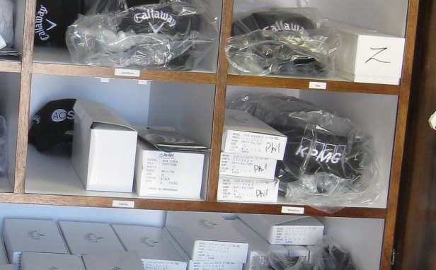 Lastly, the Callaway Tour Truck made its first ever appearance at our Austin office today, and I climbed aboard for a tour. Not being as diehard of a golfer as some of my co-workers, I only found it to be mildly entertaining, but the one cool thing I noticed was this cubbyhole that the Callaway pros use when on Tour. And notice the bottom right is that of none other than Lefty himself, three-time Masters champion Phil Mickelson. Those are his trademark KPMG visors he will be wearing at an upcoming event. So that part I found interesting.