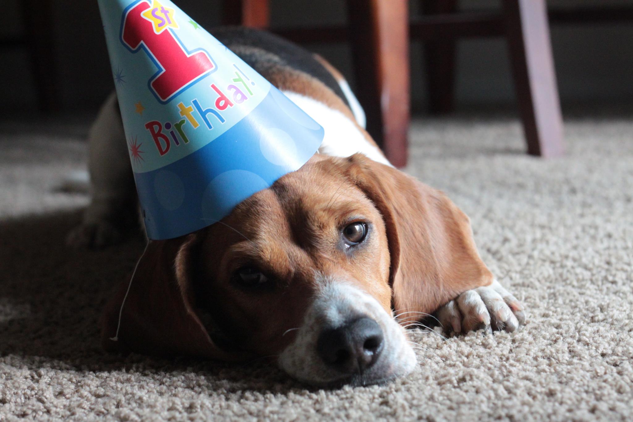 • Baxter celebrated his first birthday last Friday and celebrated with balloons, party hats, a gourmet doggy cookie, and a few new bones. He even got a present in the mail from uncles Rufus and Buster back on the farm in Carpenter!