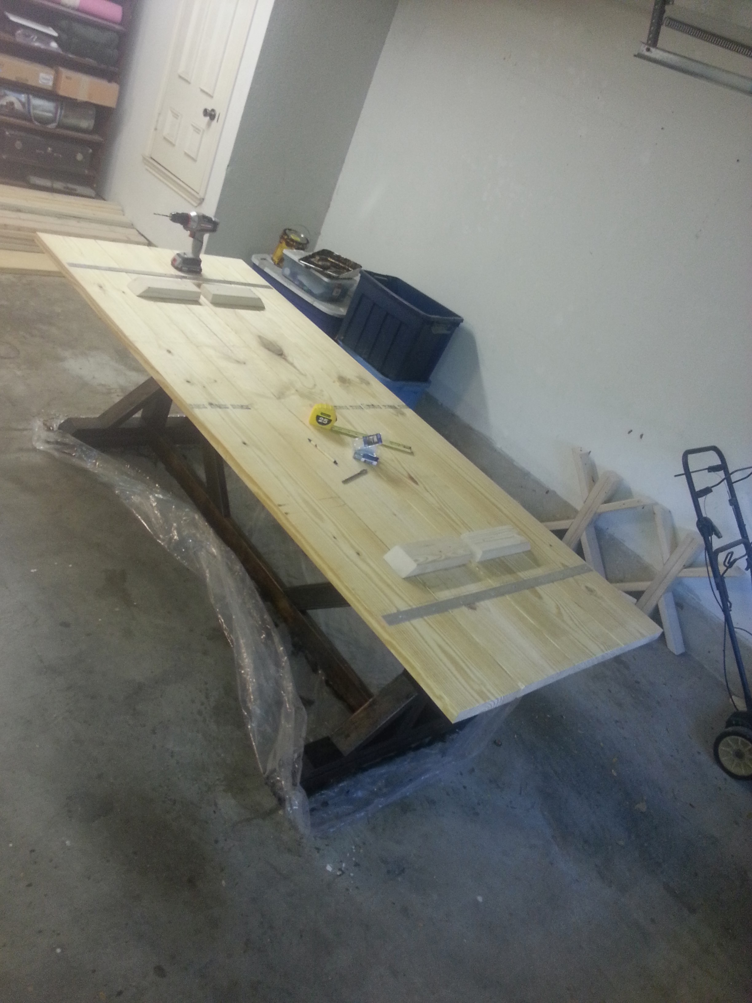 As you know, I have long been building this dining table. I managed to finish up the building part the other day, as you can see below. It was Lauren’s idea to keep the boards together by screwing on some metal strips. I also rigged up these little wooden braces of sorts that will hold it firmly into place onto the base without having to be permanently bolted down or anything. Genius idea! Now we can haul it into the house in two separate pieces and put it back together easily, or we could move it in the future without disassembling it.