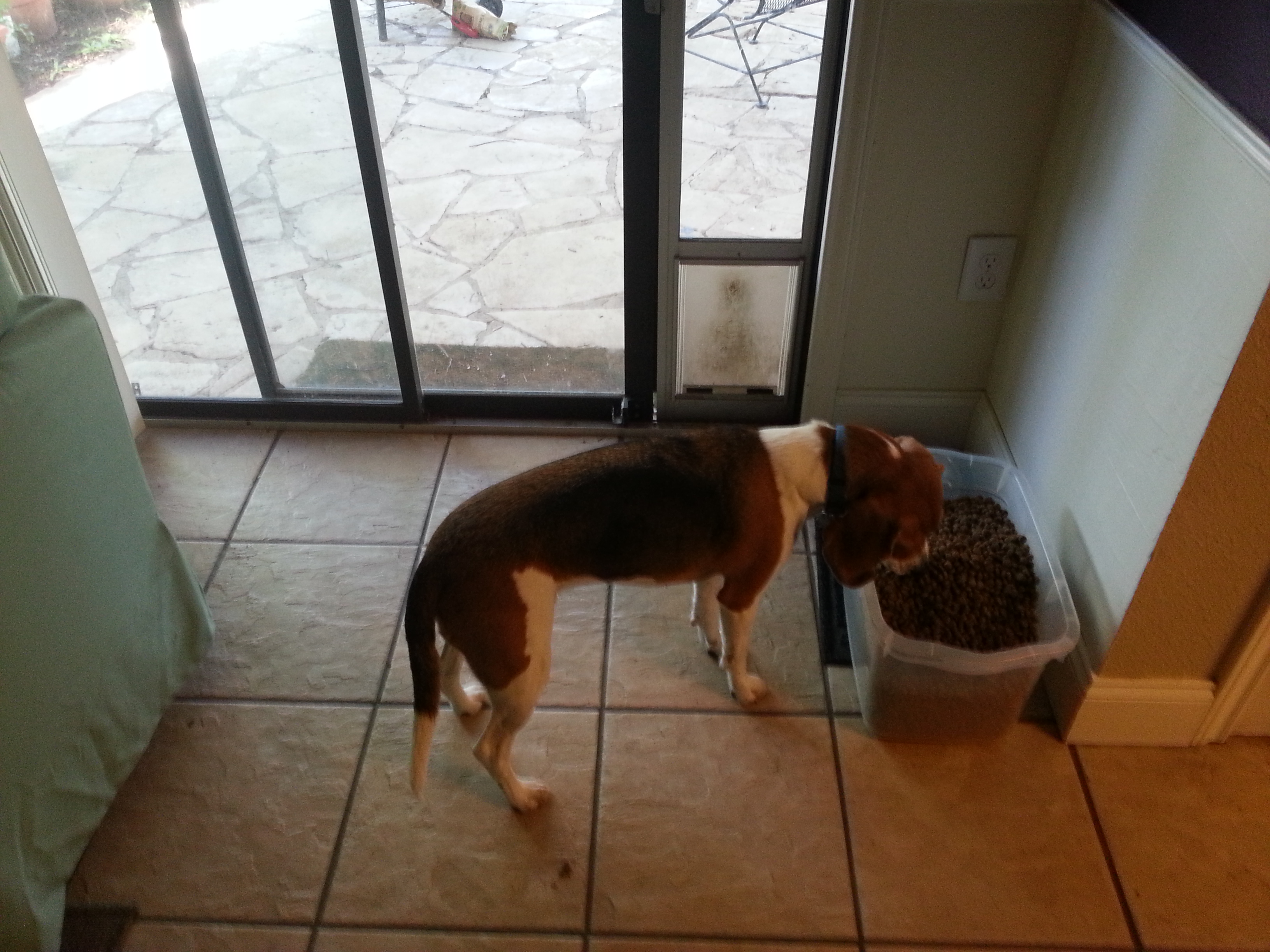 To celebrate a little early, I gave Baxter permission to eat straight from his food bin this morning. A beagle like Roscoe may have finished the whole thing, but Baxter doesn’t like his dry food enough to put a dent in it.