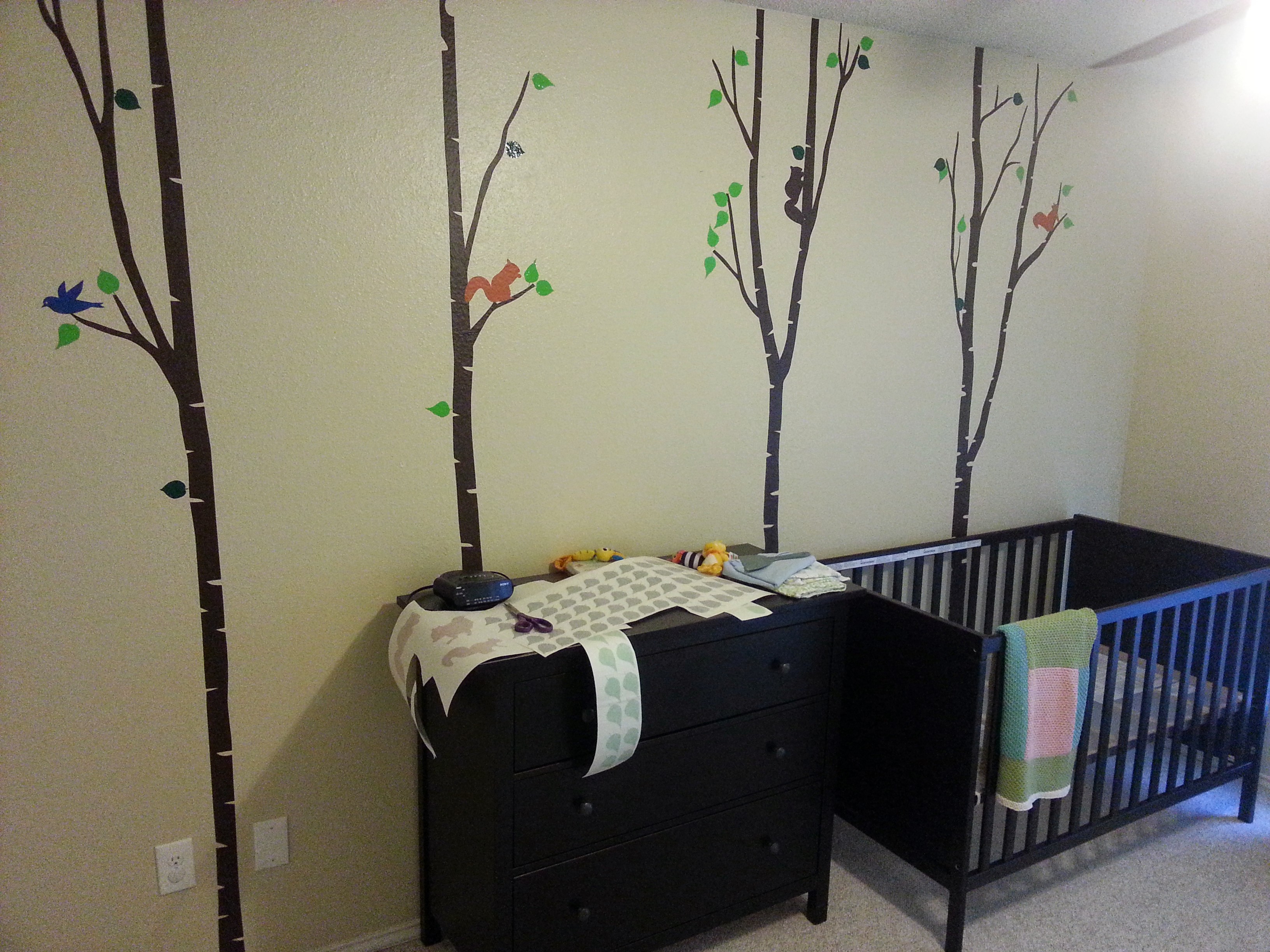 Today I started the tedious process of putting up the giant vinyl decal trees for the baby room. There are hundreds of extra leaves and birds and squirrels and deer and chipmunks to go up yet, but here is what has been accomplished. We also bought some vinyl trees to spruce up our bedroom.