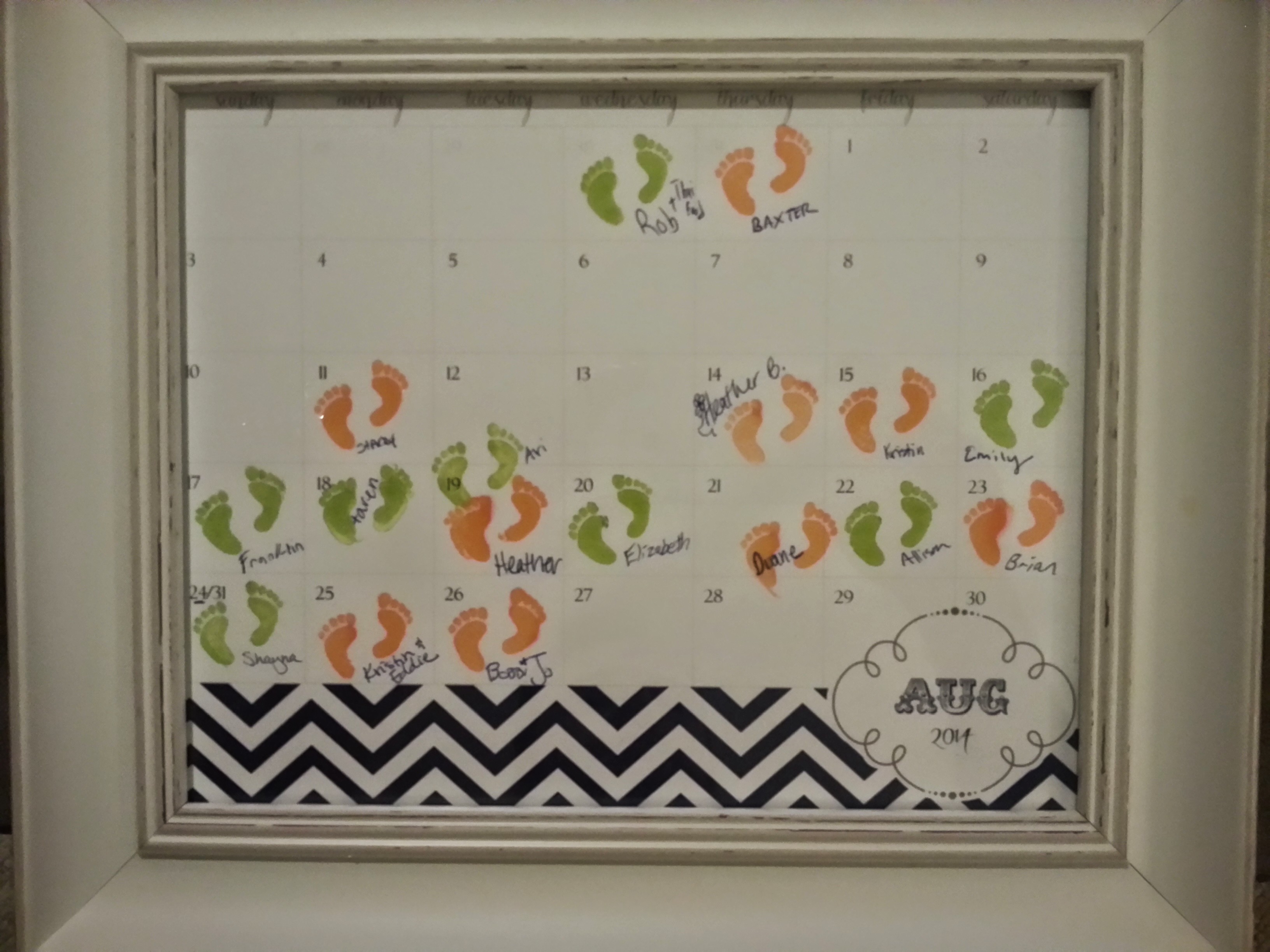 Sadly, we forgot to capture any photos. But guests filled out this calendar with their predictions for gender and birth date, which was framed and given to us as a memento!