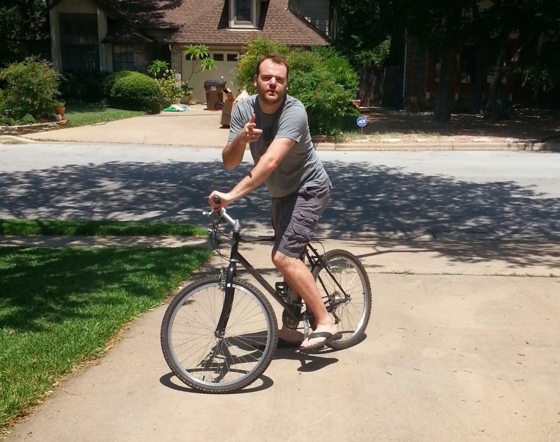 As I mentioned, I got a new bike today. I have been itching for a bicycle ever since my last one was stolen in Uptown Minneapolis four years ago. I went to Austin Bike Barn on Lamar and bought one within several minutes. I had a blast cruising around the neighborhood today, and even rode across the street to return a movie to Redbox! I was hoping I could ride around the block with Baxter, but he just tries to bite the tire and nearly gets clipped by the pedals. That’s a disaster waiting to happen.