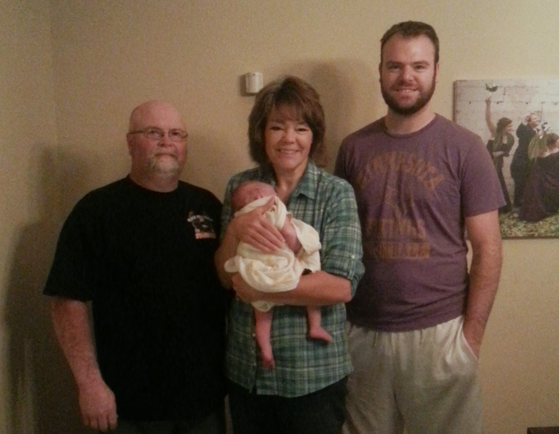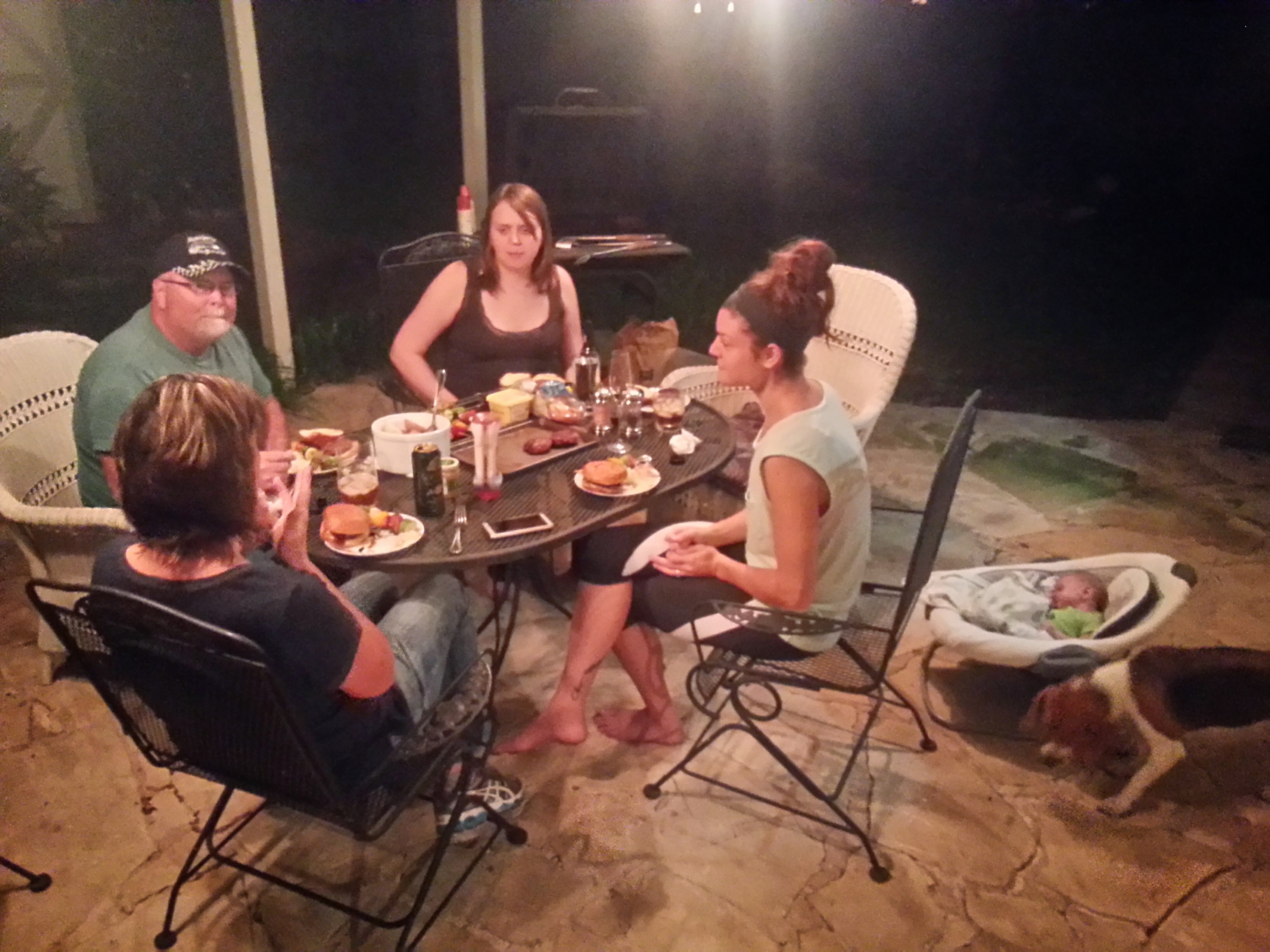 This past week Johnny met dad’s side of the family, when his Grandpa Dick, Grandma Marcie, and Aunt Jordan made the day-long drive down from South Dakota. The crew left at midnight on Tuesday morning, drove all night long, and arrived at our house around 7pm that evening. Everyone was excited to meet the newest addition to the family. Johnny is grandkid #7 for the Glanzers, and third grandson. Everyone was pretty tired and sick of sitting in a car by the time they arrived, but I thought ahead and bought everyone’s favorite drinks–brandy, cider, and Moscato. We cooked burgers, veggie kabobs, and potatoes on the grill and everyone was merry.