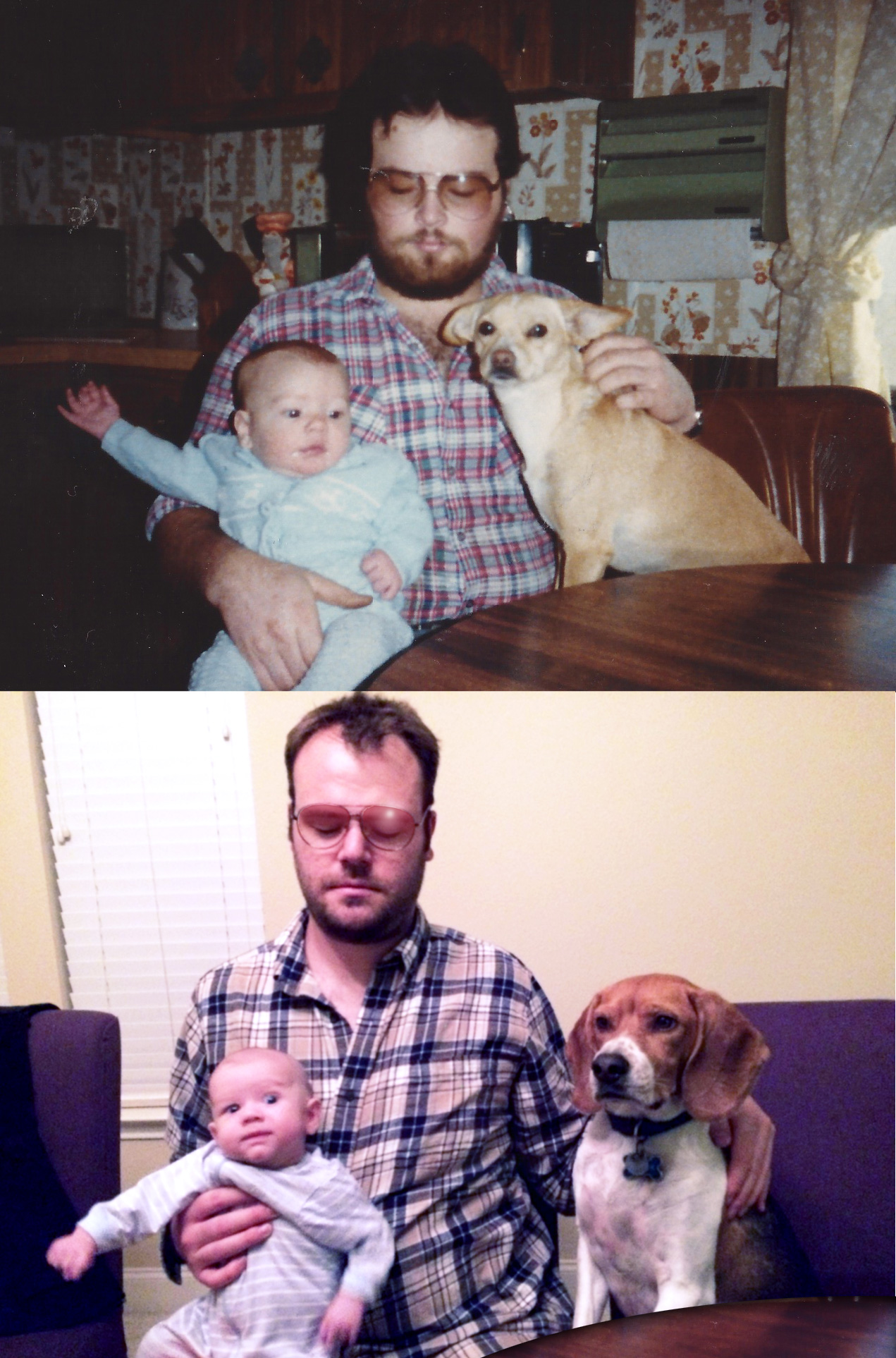 As you see below, here’s a perfectly easy photo to recreate, since Johnny is virtually the same age as I was here. Ideally I would have taken the photo in the same place and used the same background as it looks today… unfortunately the trailer house is no longer in the family, and as far as I know, sits mostly vacant at the Missouri River as a summertime fishing retreat for someone. Even so, odds are the inside has been changed. If the house is still standing, I would imagine the kitchen wallpaper would be in tact. The table we’re sitting at was in our Minneapolis apartment until the time we moved, leaving it to Lauren’s brother, who we presume left it with his roommate. So a full recreation would have been impossible. However, I decided to dress like Dad, dress Johnny like me, and attempt to get Baxter to pose just like Puppy, all while sitting in our current dining area. I did wind up Photoshopping the tint onto the glasses, and snuck in part of the old table into the corner. Otherwise it was realistic. Thanks to Lauren for taking about 24 shots… believe it or not Johnny and Baxter were the easiest to pose. I kept laughing and ruining many of the shots.