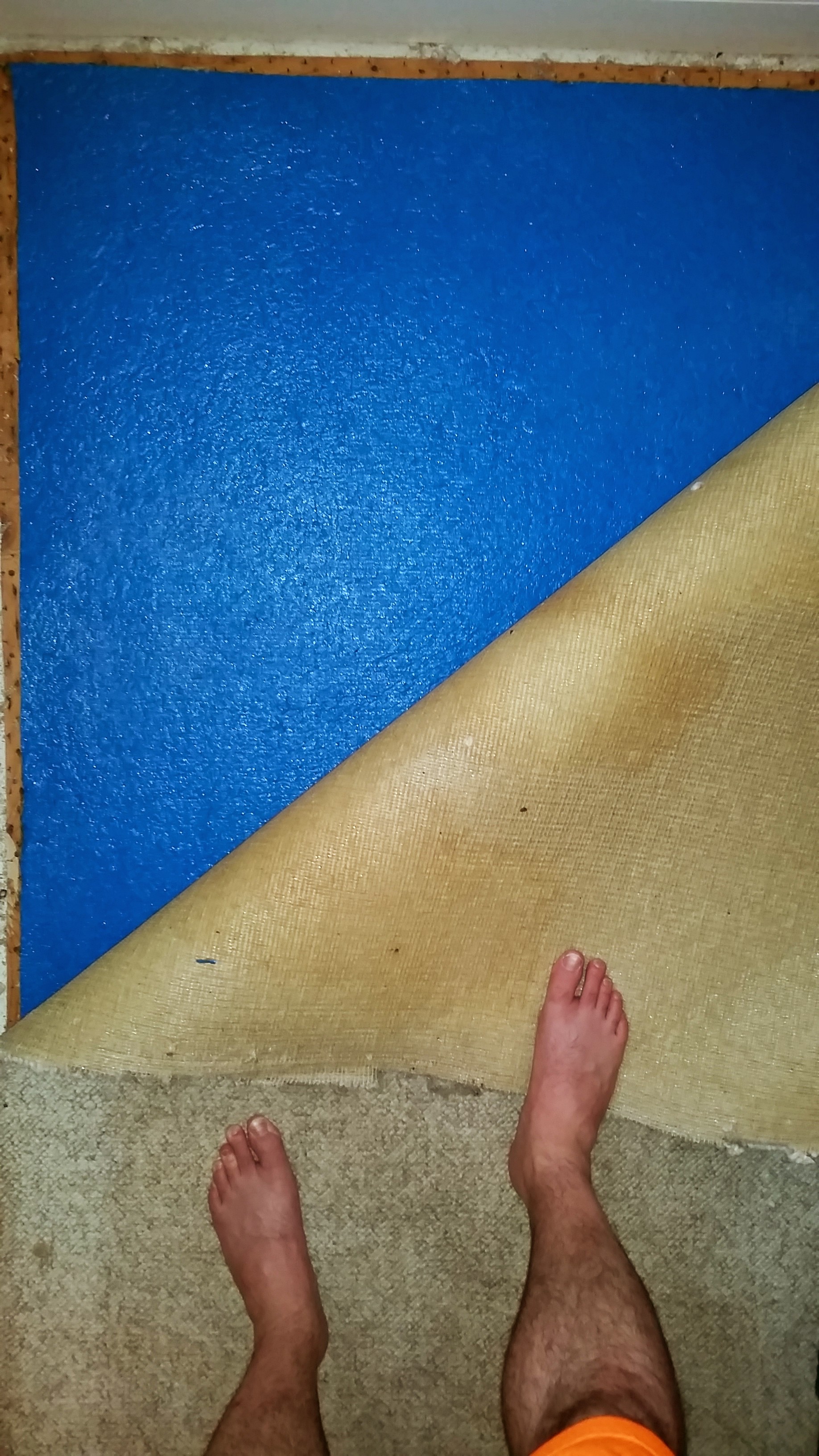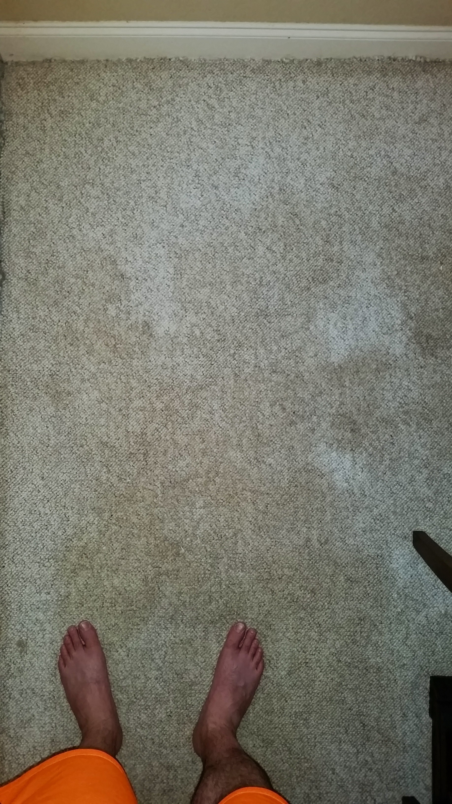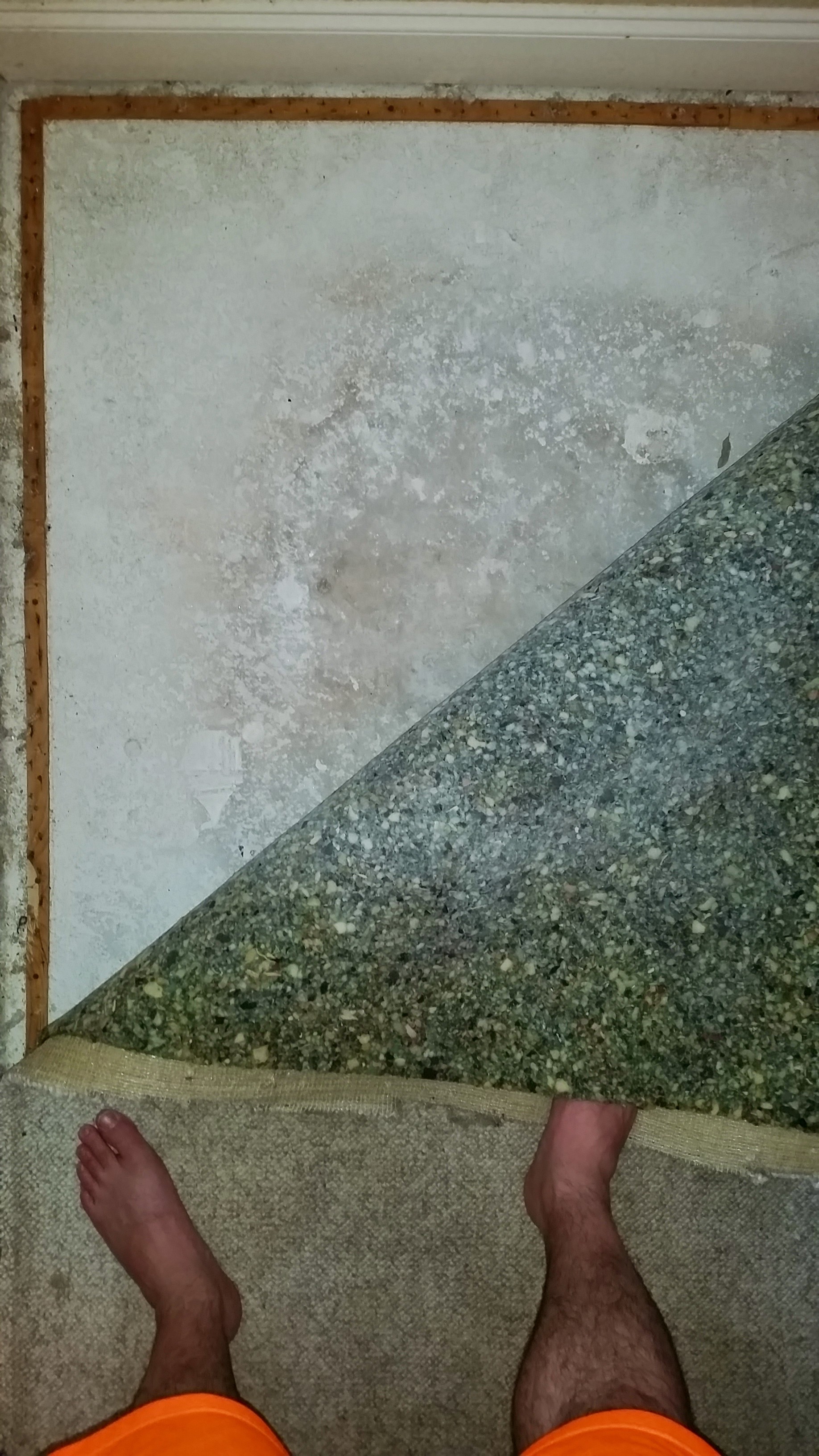 Leave it to someone who is an expert in flooring to explain that in Exhibit C, what looks like staining on the slab is in fact the normal look of the slab; the clean outer edges are where the builders patched things up with some plaster. The moisture detector in that area came back with a normal reading. Add in the fact that the padding in between is so new looking, and we now know that the staining on the carpet couldn’t be the result of moisture on the slab, otherwise the padding would be filthy too. Rather, it must have come from above. Acrylic carpet is apparently known for its difficulty to get clean, so the grimy look must be due to wicking in the fibers after a shoddy cleaning job.