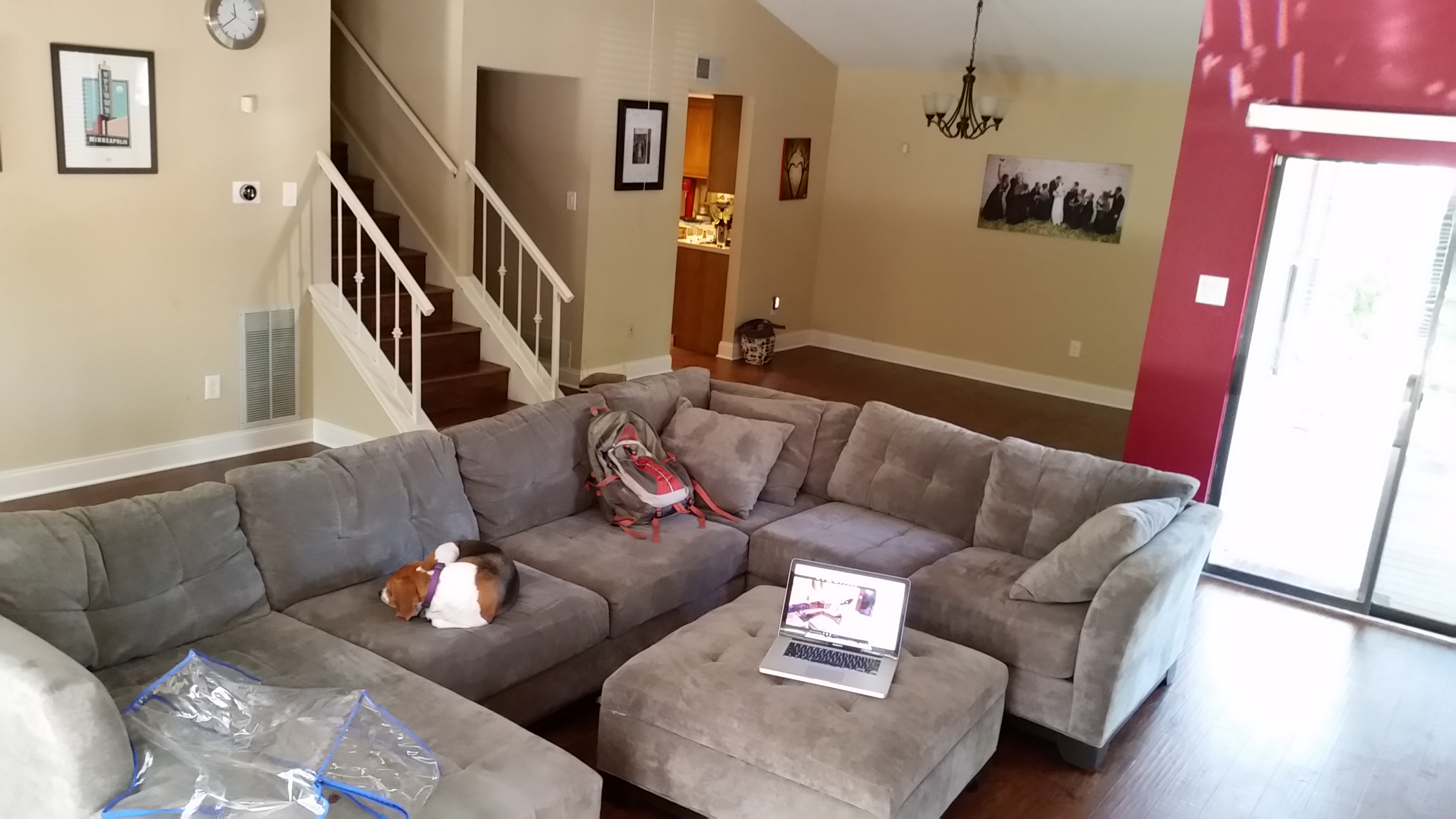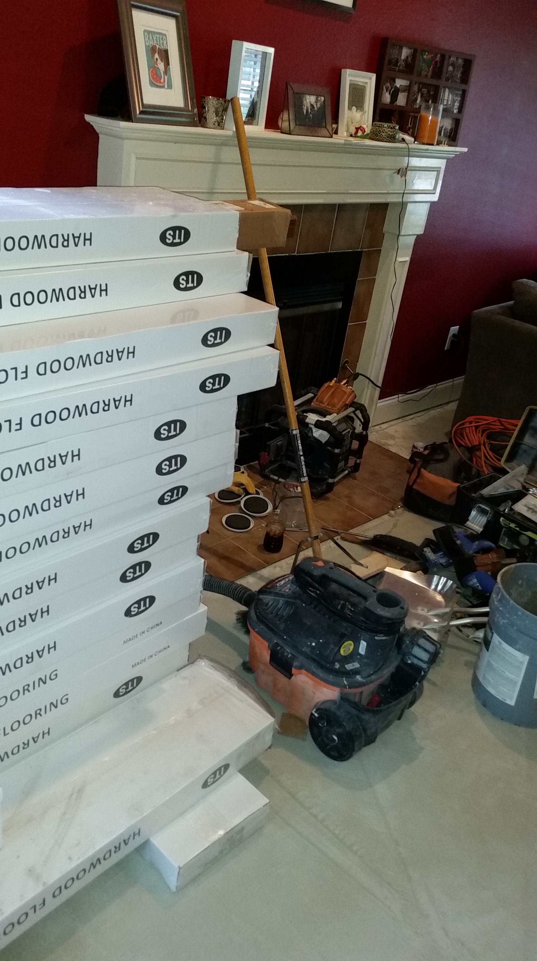 We’ve had Chuck Caudill’s flooring crew out here the past three days installing our new hardwood floors. After spending most of Wednesday and Thursday on ripping out the old carpet and tile and then smoothing the slab, they made some excellent progress on Friday with the installation. The shoe-mold isn’t all in, and the stairs and upstairs are unfinished, but I couldn’t resist posting some before-and-after shots of what has been accomplished so far. Once they finish on Monday or Tuesday and we get all our furniture fully back into place, I’ll get some more photos added.
