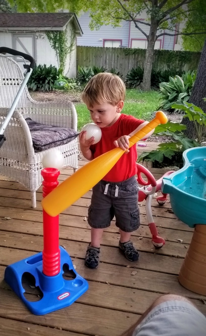 Little Slugger! He held the bat normally but then tapped the ball off the tee with the knob of the bat.