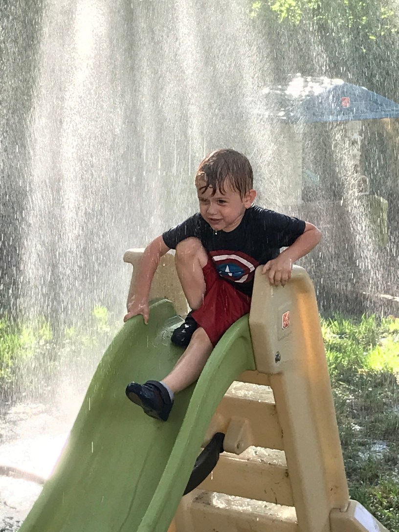 Johnny enjoys some slippin' and slidin' in the extreme heat. A true Texan, saying "it not hot out!"