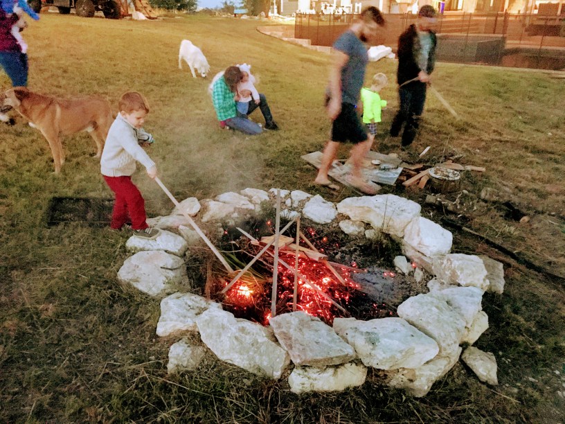 Last weekend we joined our friends the Andersons and several other families at their rural Austin home in Hill Country for a night of camping. The temps had finally cooled off enough to where one could comfortably sleep outdoors. It was to be Johnny’s first ever camping experience, and it got off to a rousing start. I bought a new family tent (which dwarfed the other families’ tents… perhaps 8-person was overkill) and we set it up just before dark. The campfire was soon roaring, dogs were running around the countryside, and the adults were enjoying a round of Irish car bombs!