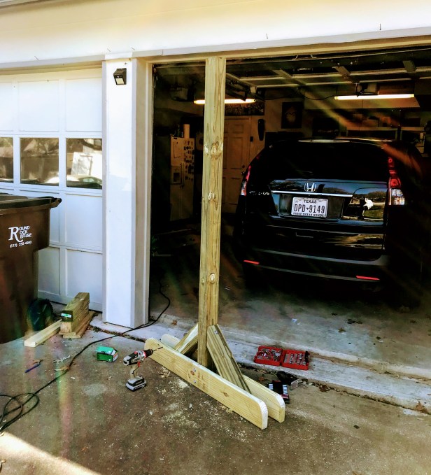 The stand is outrageously heavy, so good luck, thieves! It was fairly easy to assemble each of the posts, but putting the cross beam across the top all alone was tricky. It was also tough to put the support boards into place single-handedly, but I’ll be damned if I didn’t rise to the challenge.