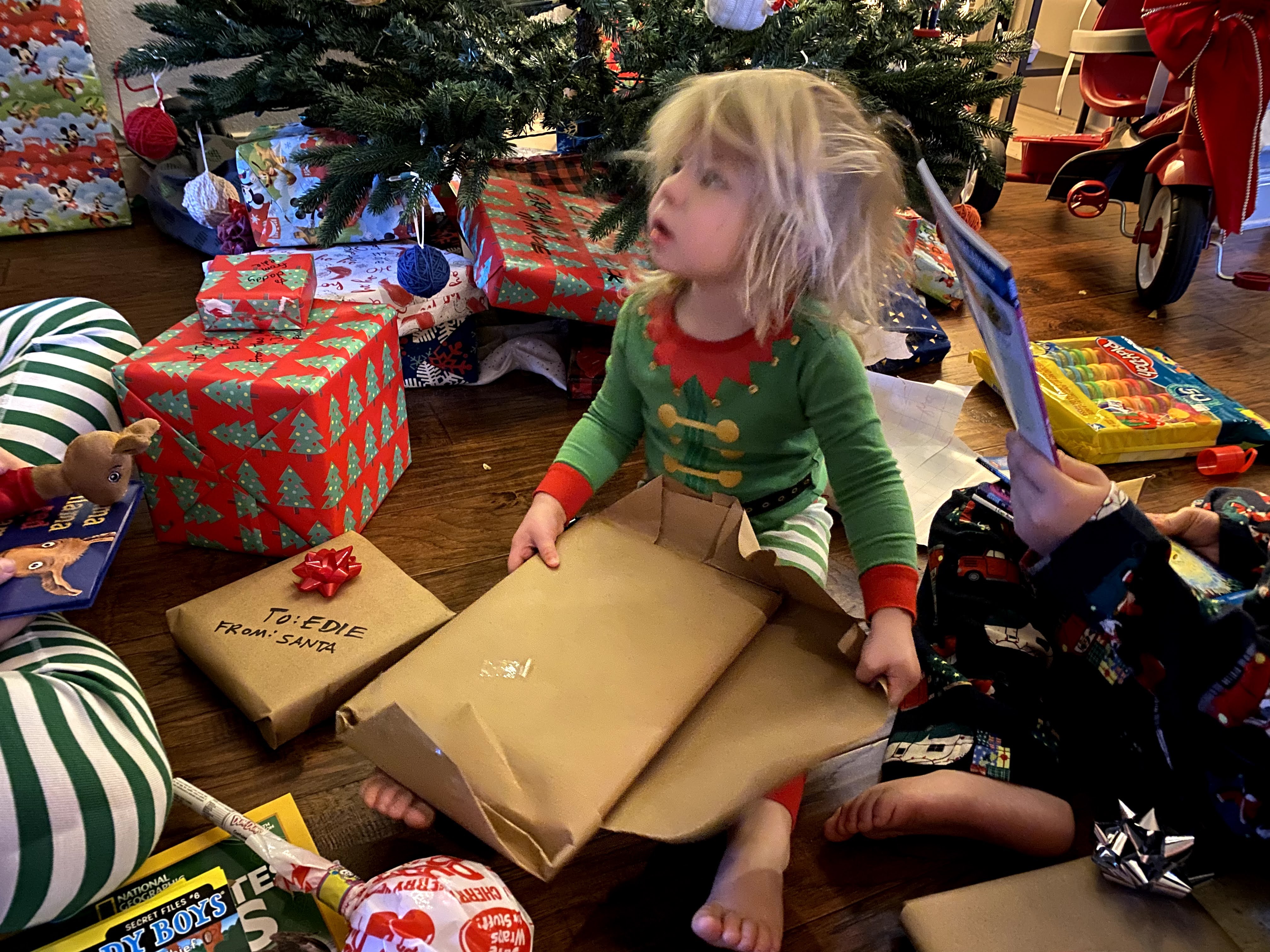 November – No, things had not returned to normal at all. Daily records were being set for new cases, hospitalizations and deaths from coast to coast. On the 6th, the election was a back-and-forth affair, and we woke up on the 7th not quite sure who the winner would be, as so many mail-in ballots had to be counted. Also that day, I put up our Christmas lights. If ever there was a year to enjoy some prolonged cheer, this was it. On the 14th, we bought a random dog mascot costume at a garage sale. The very idea that something like that made it into a year-end recap tells you all you need to know about the year. On Thanksgiving Day, I tried to do a full 5-mile Turkey Trot with the kids, Edie in the stroller and John on bike. Lauren had to pick up John at the halfway point. Lauren’s family dinner for 4 was nonetheless a masterpiece. On the 27th we put up our tree and other Christmas decor, and on the 28th we drove out to Circuit of the Americas for the drive-thru Peppermint Parkway.
