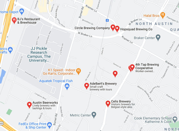 In this little area shown below, I’ve been to, and would recommend, Oskar Blues, Circle Brewing, 4th Tap Cooperative, Adelbert’s Brewery, Celis Brewery, and Austin Beerworks. Austin Beerworks gets some bonus points for having a playground the kids love.