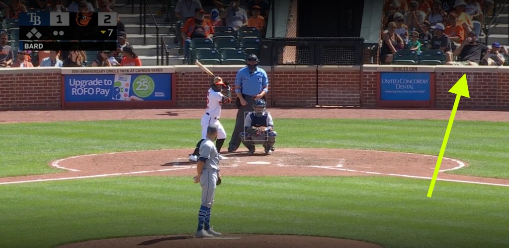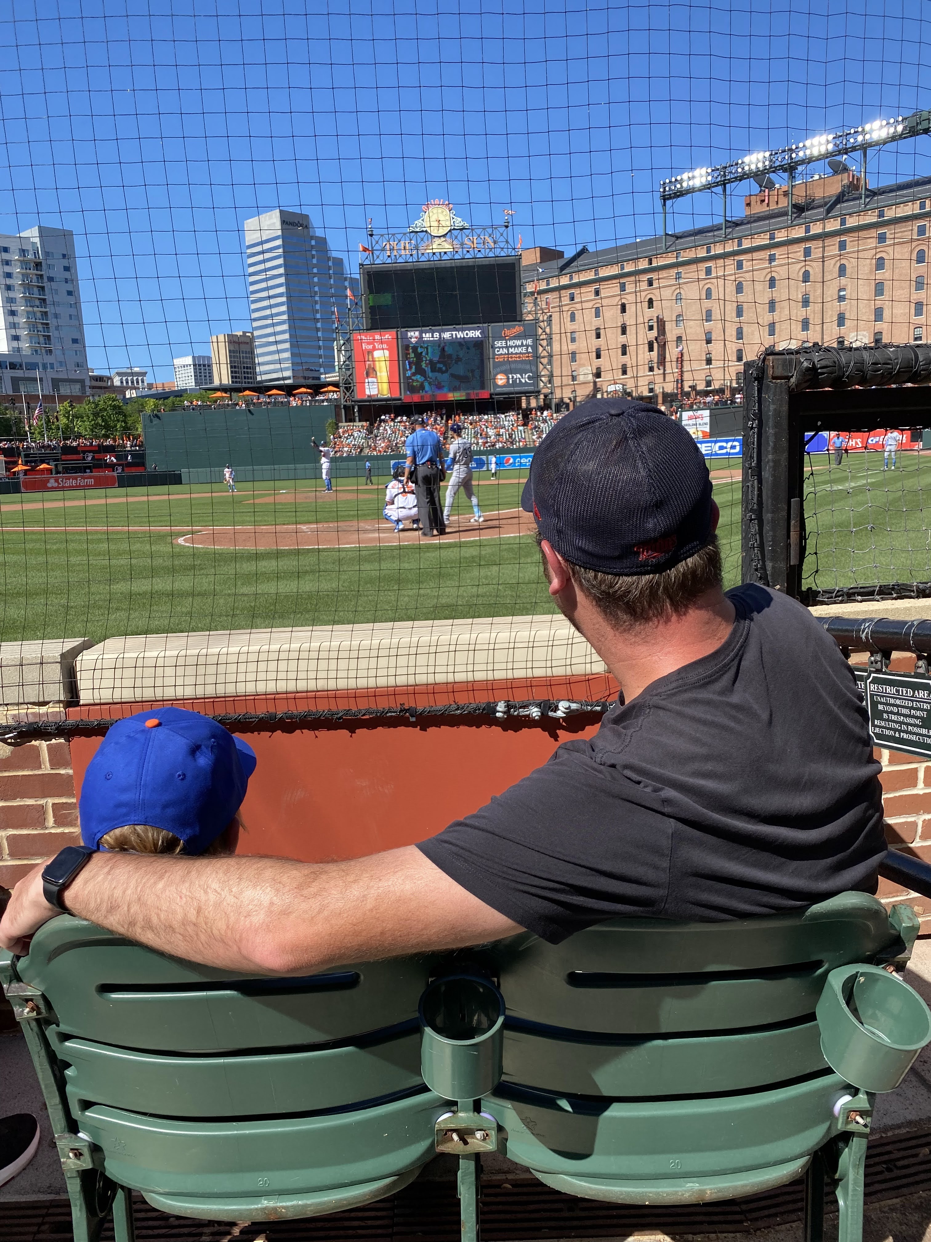 Despite our great seats, John couldn’t see. The rise in rows was so gradual, John couldn’t see over the head of the man in front of us in Row 4. I asked the usher, and true to Baltimore form, he happily led us up to the second row. That move got us onto TV, we would soon find out. Sitting in Row 2, we were completely visible the entire telecast. (Yes, I checked MLB.TV repeatedly on my phone to verify.) Being seen on TV is still fun to me, maybe less to others. As I sipped on my “Steady Eddie” Murray IPA, cracked peanuts, basked in the sun on a beautiful day, chit-chatted with a kind stranger from Cleveland, watched a random Orioles-Rays game from mere feet away with my baseball-crazed son at my side on Father’s Day, and was repeatedly met with nothing but overwhelmingly friendly Baltimore folk, I realized I was in baseball heaven. The Orioles won a tight one, 2-1, highlighted by quite a few defensive gems, and after the game ended, the home plate umpire handed John a baseball on his way off the field. What more could you ask for at the ballpark?! I may go so far as to deem this a top 5 experience of my life.