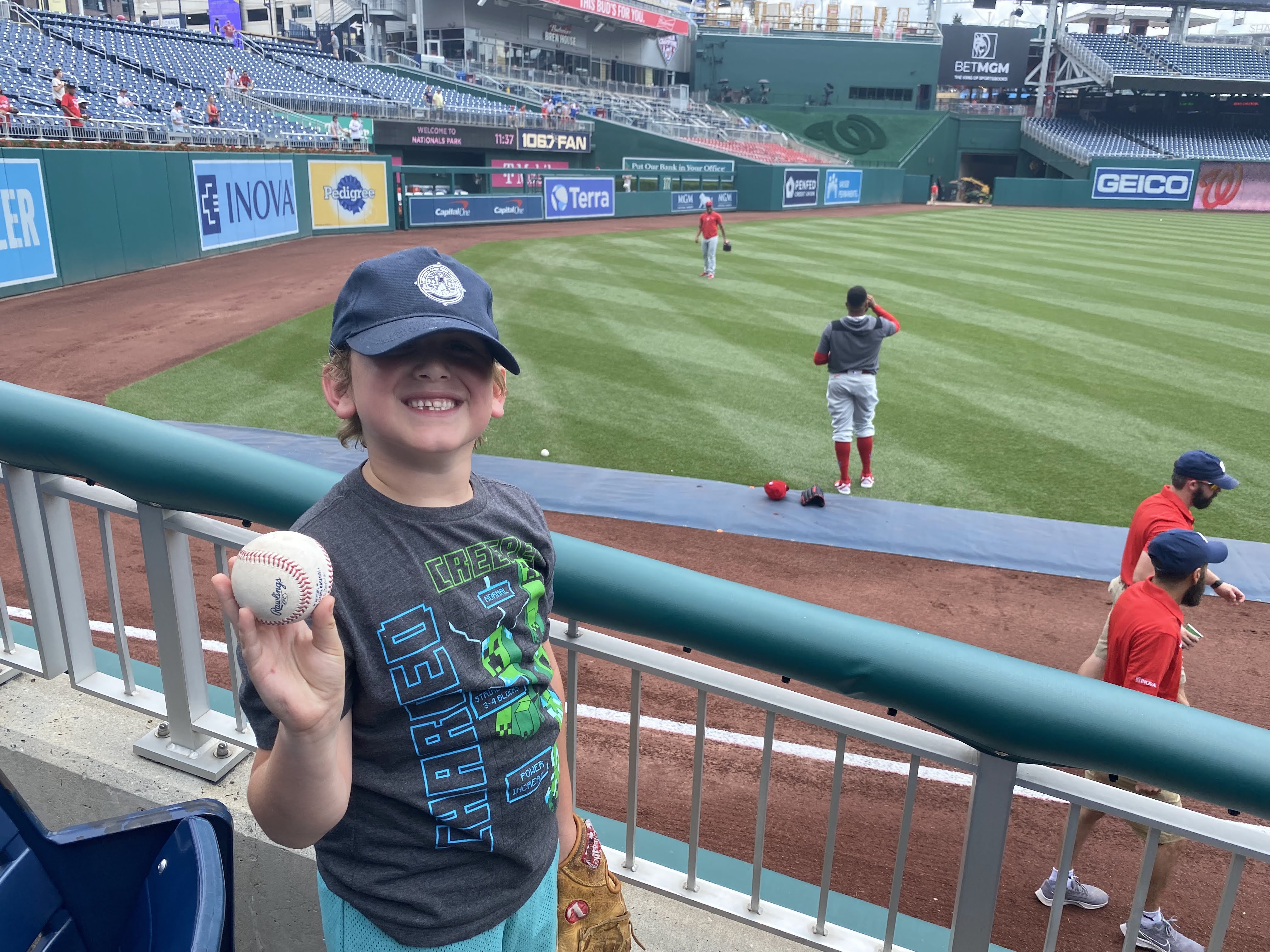 As for the game, our seats were great and attendance was sparse, which allowed John to snag several baseballs. We received a second one thrown in our direction from Phillies outfielder Kyle Schwarber. A man caught it and passed it over to John. The next inning, Nationals left fielder Lane Thomas threw me a ball, which I obviously gave to John. John then graciously found a smaller kid to give the ball to. That kid then got several more balls during the game too, haha. It sounds impressive, but after virtually every half inning, the left fielders tossed the ball into our area which as I said had very few kids braving the heat. John and a handful of other kids each got their fair share. To leave an MLB game with multiple baseballs feels greedy, but when you consider how few people there were, and how generous John was, I felt it was fine. The game itself was rather unmemorable, with the Phillies winning 5-3. John and I left a little early to rest in the hotel between games. At the hotel, John randomly lost a tooth! (The tooth fairy found him but only gave him some candy. As you’ll find out later, I had no coins on me.)