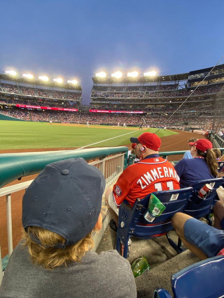 As smoothly as everything had gone up to that point in the day, things got a little rocky at night. After grabbing some Chipotle for dinner, John’s request, we headed right back to the stadium for Game 2, which was much more heavily attended due to it being a night game and a special Ryan Zimmerman number retirement ceremony with t-shirt giveaway. Our seats were in nearly the same spot, this time even closer to the field, right behind the ball girl down the third base line. On the first batter of the game, the ball girl got a foul ball and raced over to hand it specifically to John, who she had had a nice conversation with before the game, and obviously unaware that he of all kids was least deserving of yet another baseball. We had brought one of our own baseballs with us to try to get signed, so it appeared we had two from this game already. The beer vendor saw this and started screaming every chance he got “THIS KID HAS TWO BALLS! YOU SIT YOUR BUTT DOWN!” He was wrong—that ball was our own—but at the same time he was correct that we should not be given any more baseballs. He watched us like a hawk all game long from near and far, screaming at every turn for us to sit down. We weren’t even trying to get any more baseballs, we simply stood up between innings for one reason or another and he screamed across the stands at us. It was almost as bad as last summer’s Round Rock fiasco with the angry usher. I could just let it go, but I think I’ll still complain to Guest Services at some point. John was nearly in tears at the mean beer man.