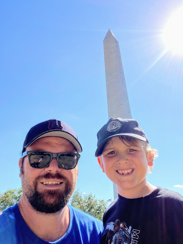 After lunch we saw the Capitol (from a distance, John wasn’t about to walk all the way up to it) and a few other sites including a sculpture park and that famous pool. But our main destination was The Smithsonian Museum of American History. We spent three hours in it and saw every last exhibit and had a lot of fun. John forgot all about how much walking it actually was! After that, we went all the way to the base of the Washington Monument. John was having a lot of fun and no longer complaining, but then something awful happened. We ordered an ice cream cone from a truck, and it started to melt all over John’s hands! Not only that, but after being handed our ice cream the vendor informed us he only accepts COINS. Yes, coins. I obviously had none, and I left with the promise I’d come back with $20 in quarters later, which I did not. Maybe I’ll try to find him online and pay somehow. But the real drama was John got extremely sticky… hands, arms, hair, face, even legs. He was absolutely freaking out, but there was nowhere to clean up. We walked and walked and walked in the direction of the hotel, hoping for a bathroom or water fountain or even a pond… nothing. At 2% battery, my phone was acting a fool and thought we were miles from where we were, making it impossible to get an Uber. We finally stumbled into the International Spy Museum and used the bathroom, and a nearby hotel had a taxi cab waiting, giving us a ride back to our hotel. The cabbie was trying to make conversation with us. He said he’d been living in DC for 17 years. I said “You like it, huh?” He replied “That is a bad question. That is a terrible question. Why waste your breath asking me that! You think I would live somewhere I don’t like for 17 years? Stupid, stupid!” Man, DC folks were pretty brutal at most turns! That night we ate dinner at a place called Circa, and went back to the hotel room and watched a movie together. All in all, a very good, memorable day, minor hiccups aside. And nice not to have it fully revolve around baseball.