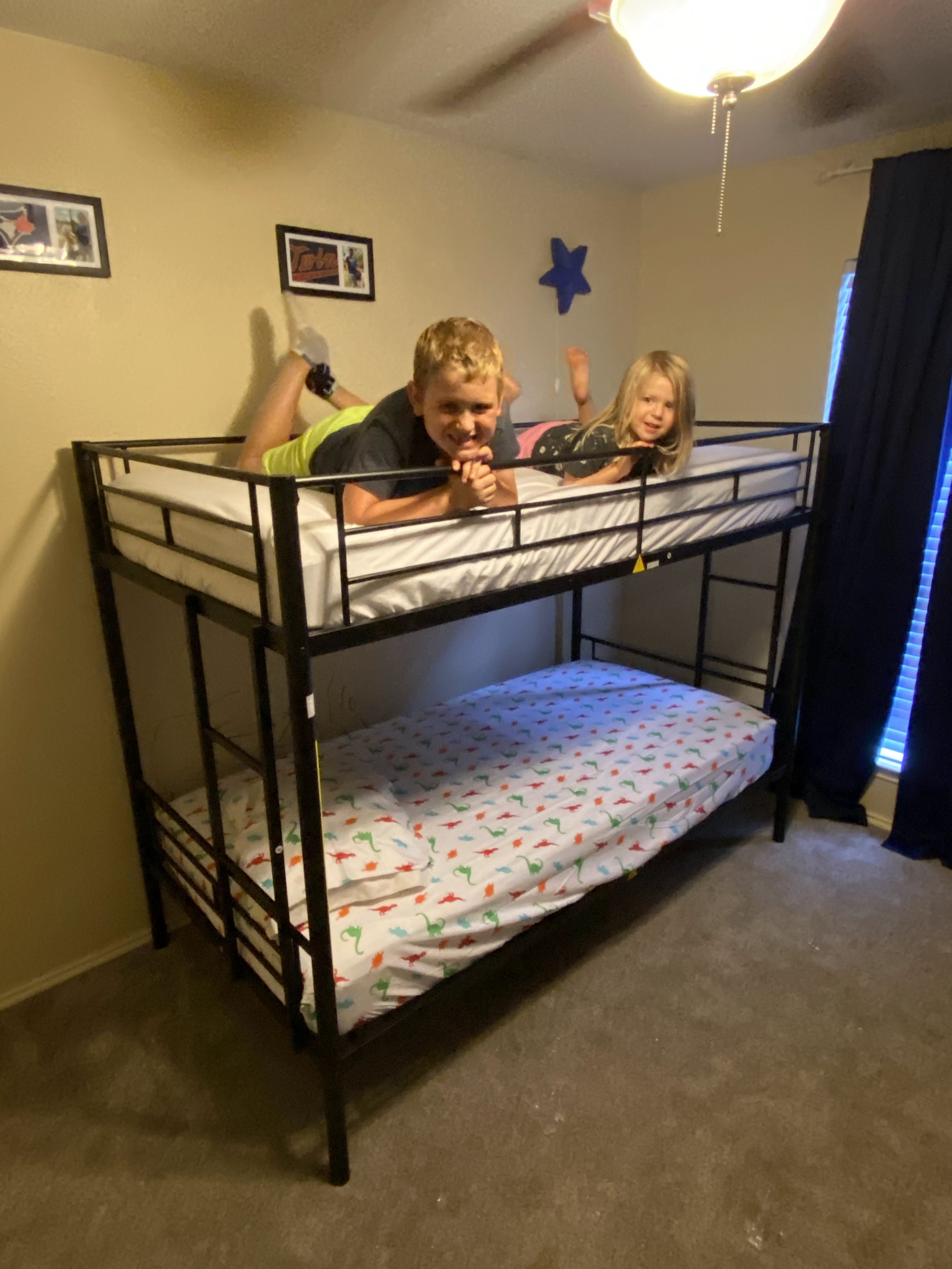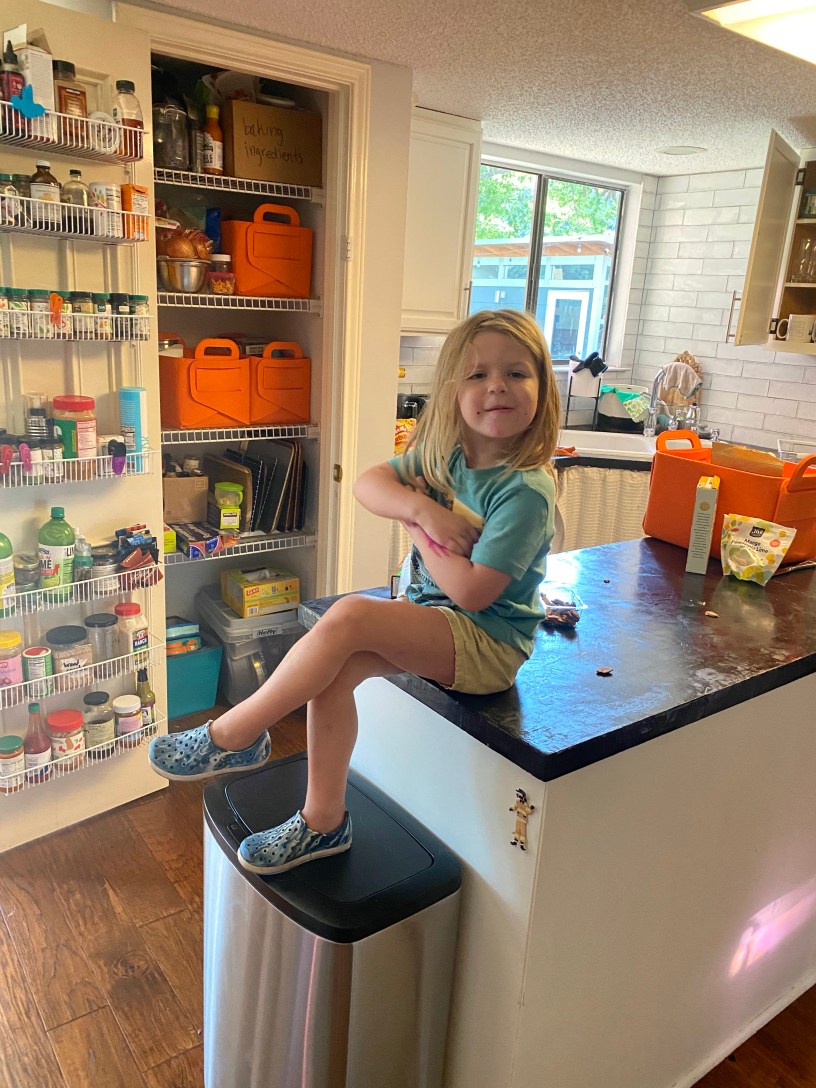 After moving into John’s room, we dealt with a lot of Edie looniness at bedtime. She constantly shrieked in glee as she climbed onto his upper bunk repeatedly, loving every second of misery she caused John. We’d yank her off and she’d giggle and climb right back up. Finally, a sticker chart did the trick. If she stays off John’s bed she earns a sticker and after 10 stickers she can pick one of the prizes she’s been yammering for—light-up Spiderman shoes or a toy ice cream cart. But it didn’t solve all the problems. Now, she stays up later the the adults! She hasn’t gone to sleep before 10:00 for the past week, and seems no worse for wear the next day. She just doesn’t require any rest. She’s as perky at 5:50 the next morning as ever. I think napping at school is partially to blame but legally they have to require an hour of rest time. I guess this is just how it will be from now on.