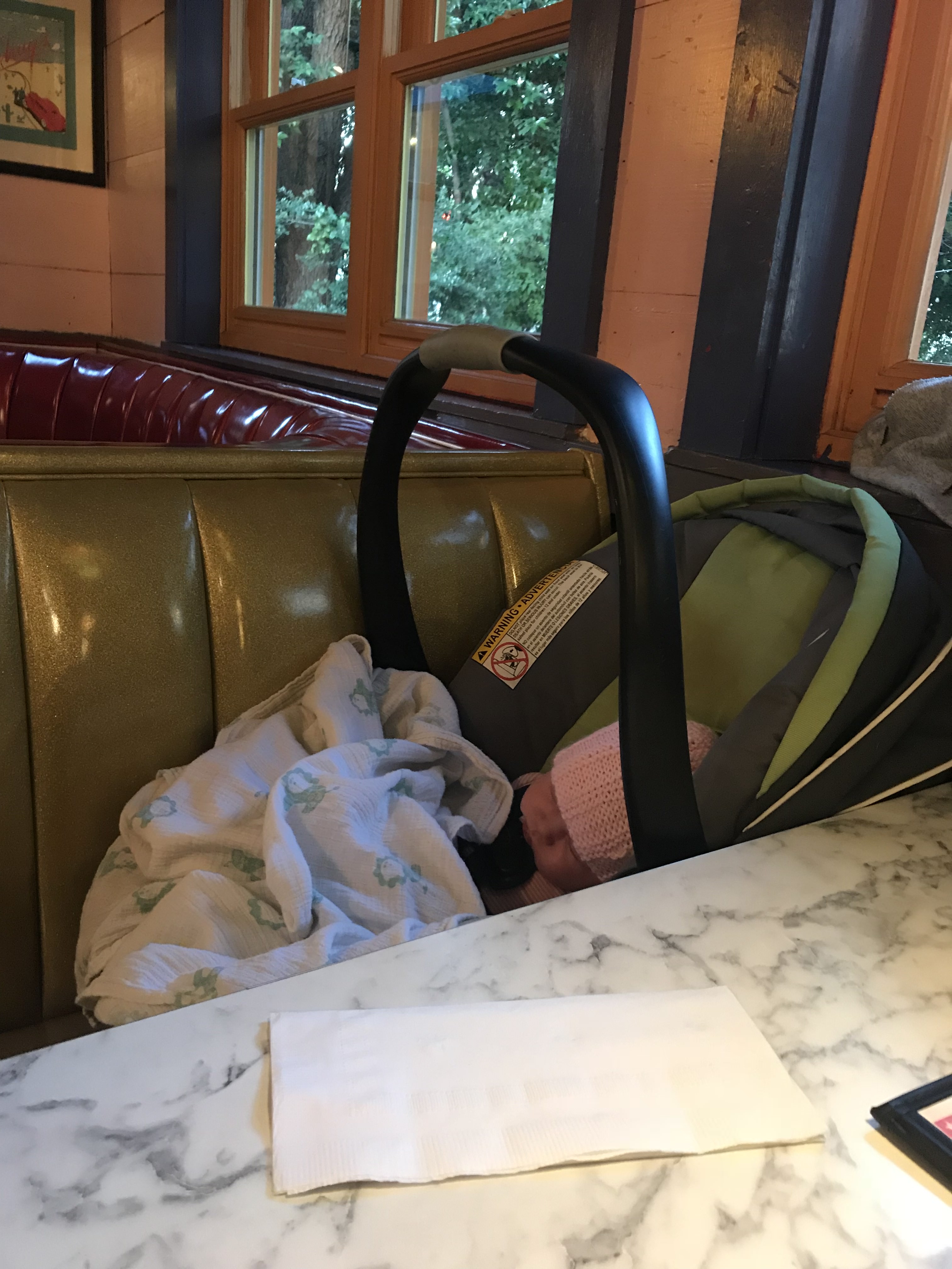 In 2018 baby Edie went out to eat dinner somewhere in her carseat.