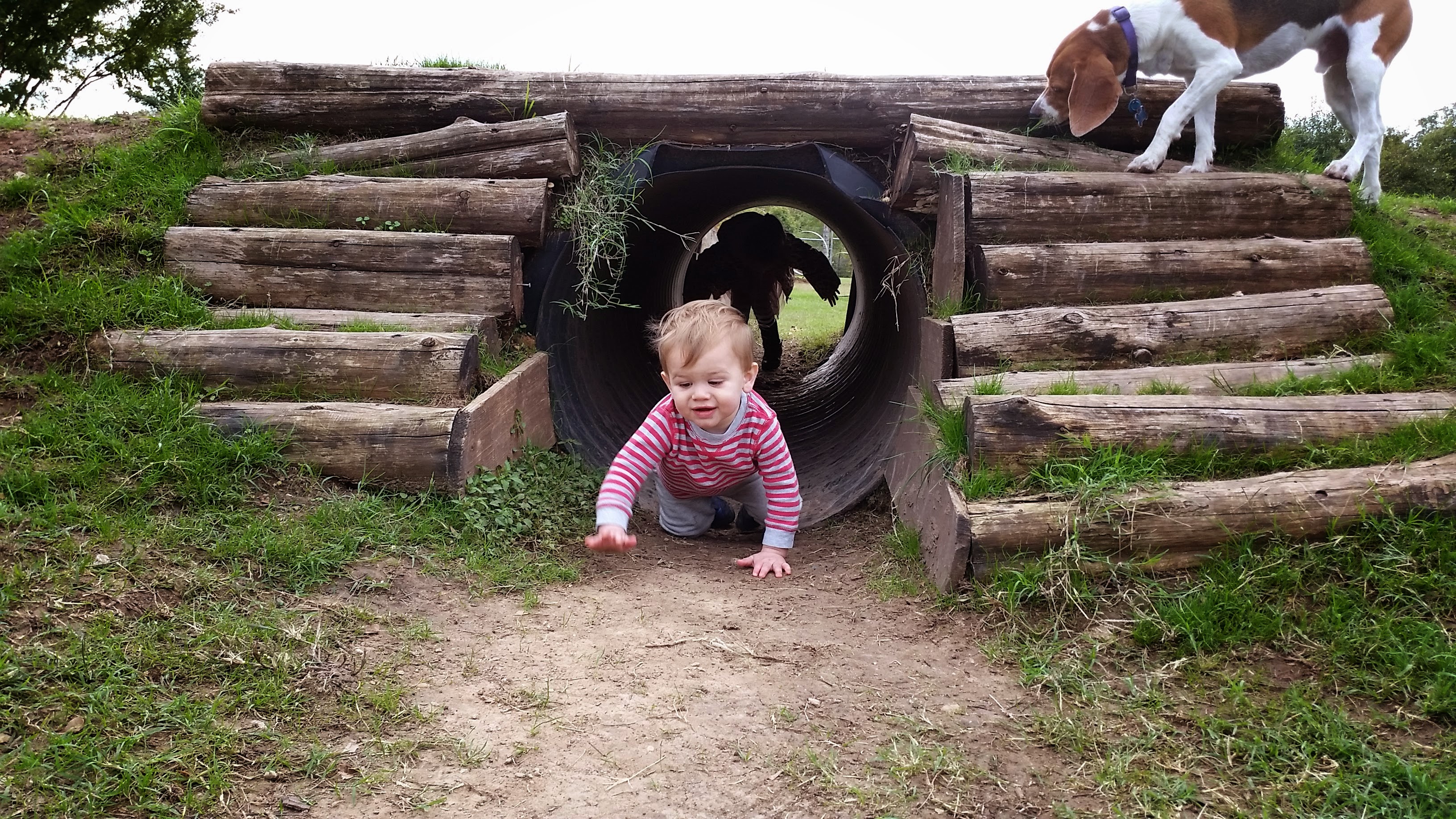 In 2015, little John crawled through a dog tunnel at the dog park.