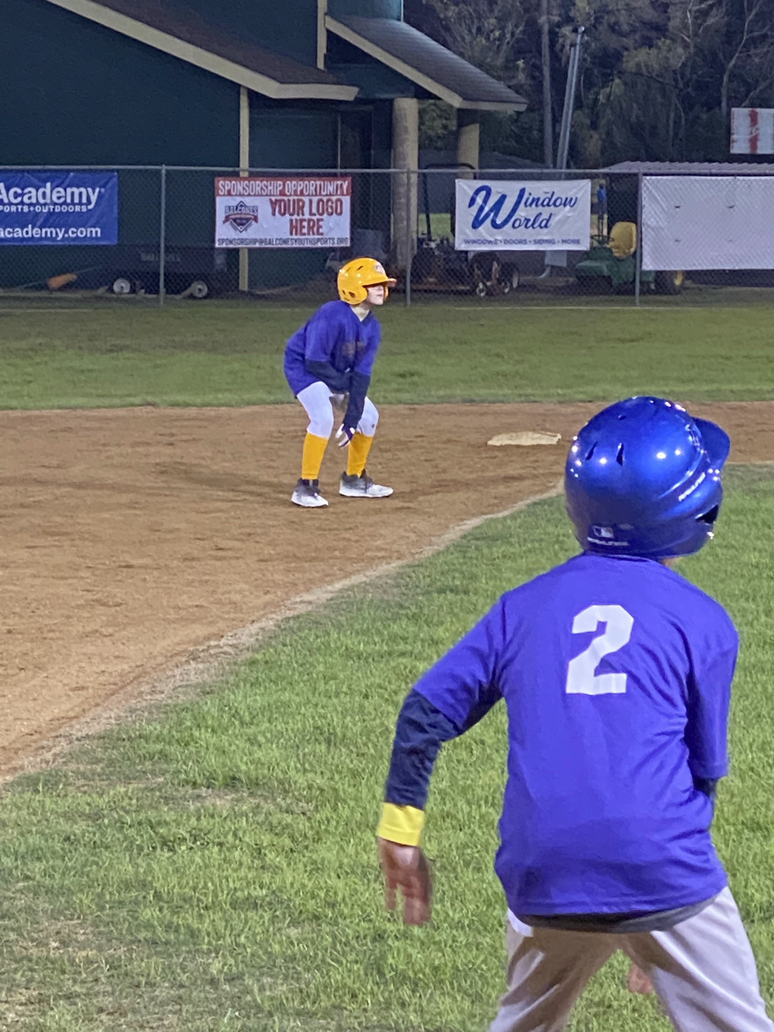 The Hooks scored only once on a wild pitch, giving them a 10-9 lead. In our half, Hudson got a base hit, tying up the game. John was the runner on second base and narrowly avoided being tagged out in a temporary moment of confusion. But he safely scampered to third. Ethan then batted, and took four straight balls to forced in John, who trotted home from third and touched home plate as the boys mobbed each other in celebration.