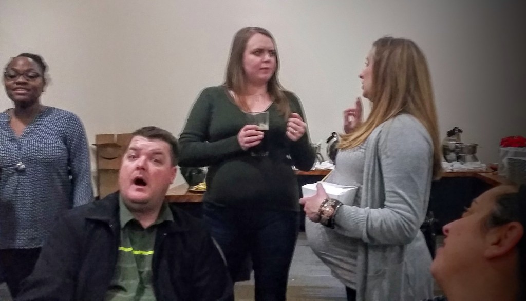 On December 4, 2015, we attended the Callaway Christmas party. Lauren chatted with a very pregnant Allison while Seth and Shenea looked on.