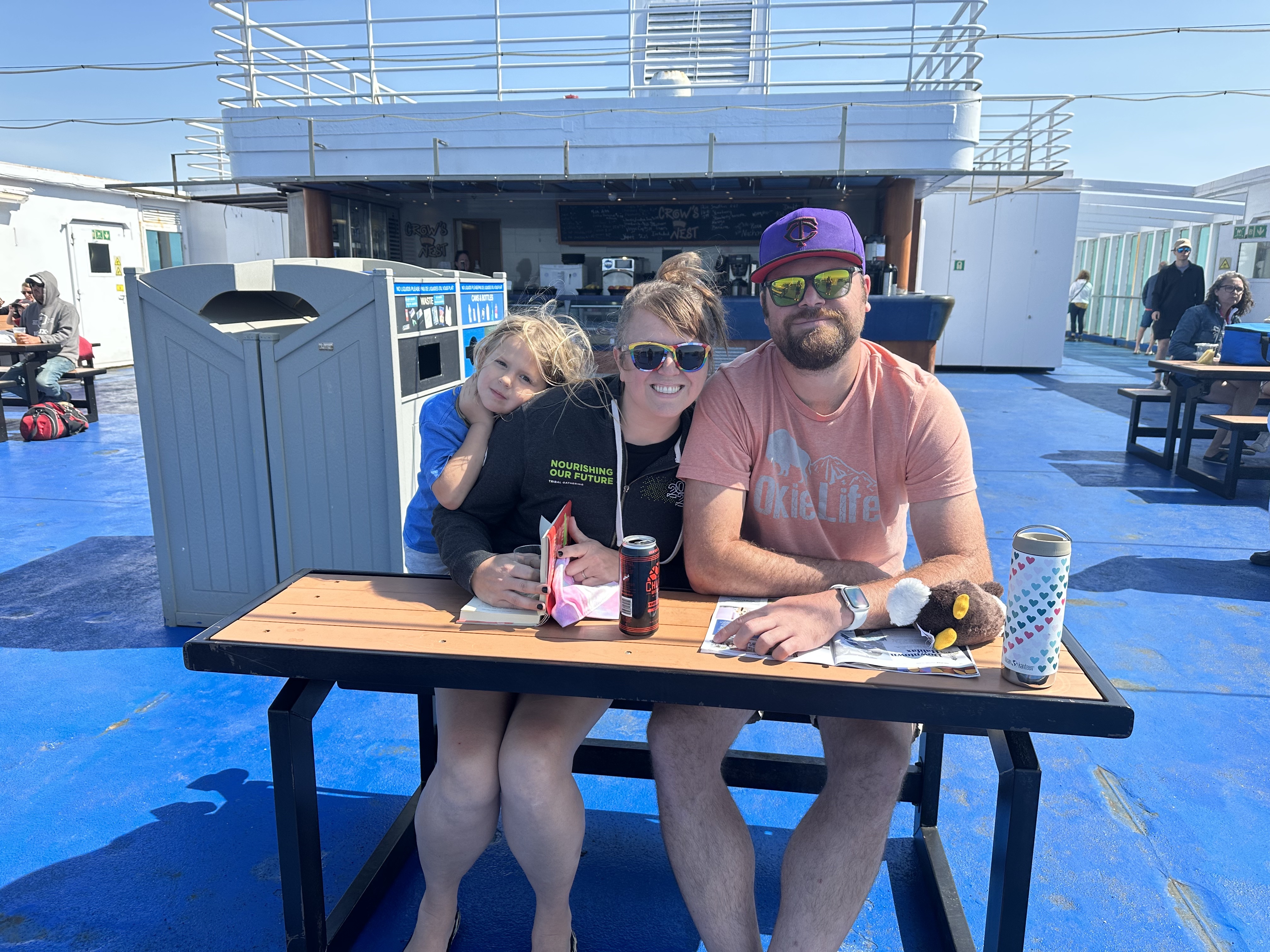 We finally buckled it in and arrived at the airport. We were early enough to where we felt we could get our money’s worth at the Delta SkyClub, which, although discounted through our Platinum Delta AMEX card, still cost a pretty penny for entry. In order to get our money’s worth of food and drink between the four of us, I would have to hit the bar pretty hard. Challenge accepted! After a few trips to the bar and several passes through a very tasty buffet line, we suffered our first setback of the trip. John got a migraine, not particularly unusual for him, sadly. At least we were in the lounge with nice places to spread out and lie down. We even moved to the outdoor patio area in the 105º weather because John found it more tolerable. After about an hour of rest, thankfully, John felt better and it was time to board our flight! We got a little pod of four seats in the main cabin. Edie insisted on sitting by me, which left John and Lauren together a row up.