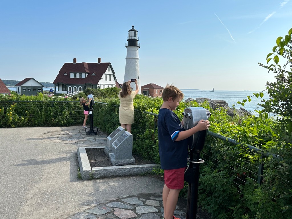 Thursday morning it was time to pack up and get back to Boston. But we couldn’t very well leave Portland without doing anything remotely Portland-related! After all, it is a pretty big tourist destination. It was very early morning so nothing was open, but there was the famous lighthouse, Portland Head Light, which is viewable anytime. It was constructed during the US Lighthouse Act of 1789. It was a very picturesque area, and seeing how it was 8am, we had the place nearly all to ourselves! We explored for quite a while and found you could go down near the ocean on the rocks. For whatever reason, the kids decided jagged rocks along the shoreline was a great place to get into their worst fight of the trip, leaving both of them in tears. John also had a bad spill. I told him that a rock looked slippery and not to walk on it. He confidently said “Wrong!” and instantaneously biffed it, really hurting and muddying his butt. We came out of the rocks in tears and hit the road. By the way, reception in that area is absolute zero, so I had to drive around for miles after just to get reception back to get us to I-95.