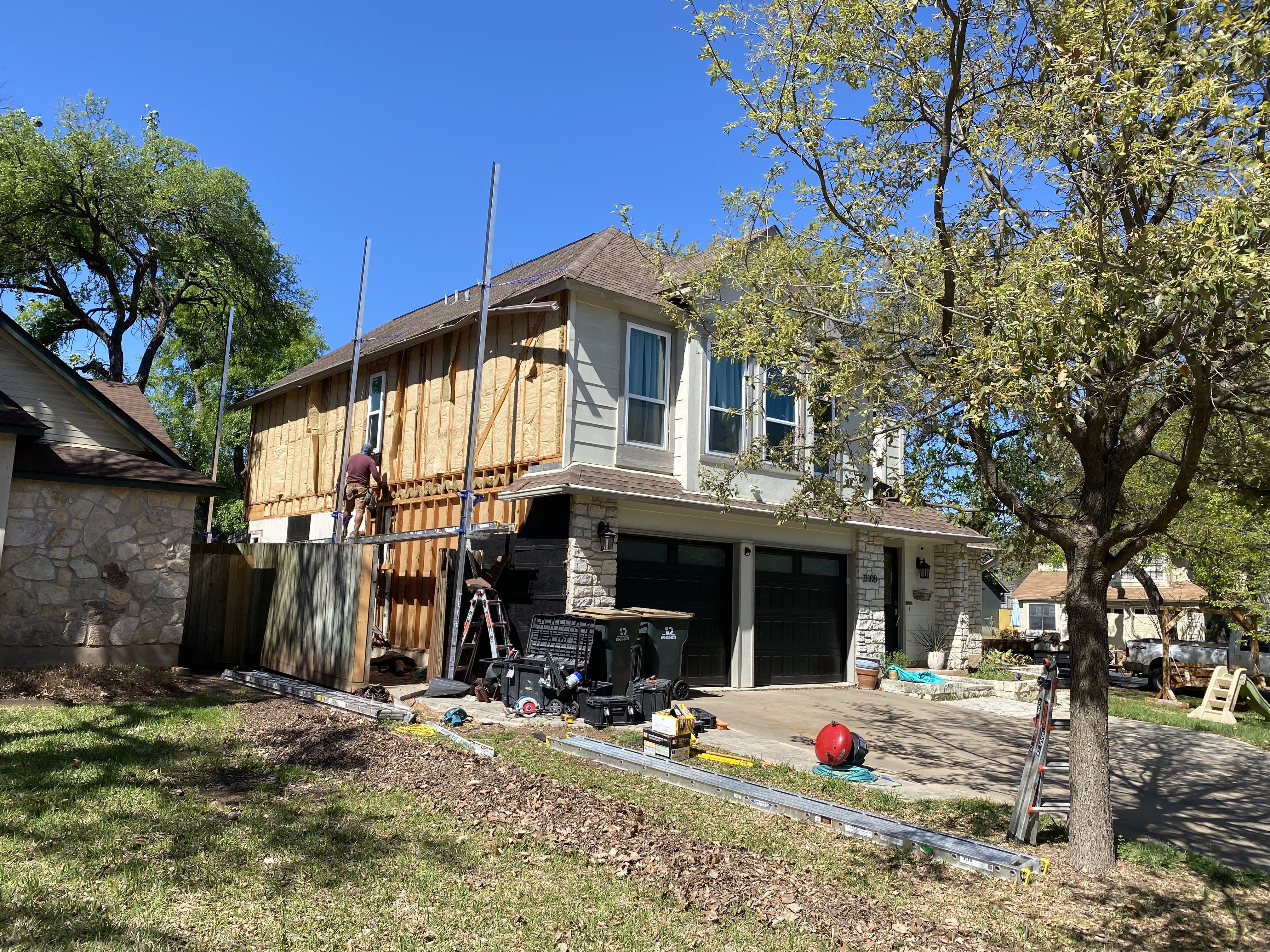 When we returned, the cleanup began. We piled thousands of branches and limbs on the curb, and tore down the old tool shed. Tree crews worked to tear down three entire trees from the backyard that were badly damaged in the storm.