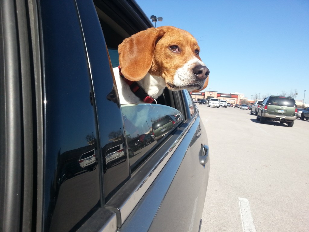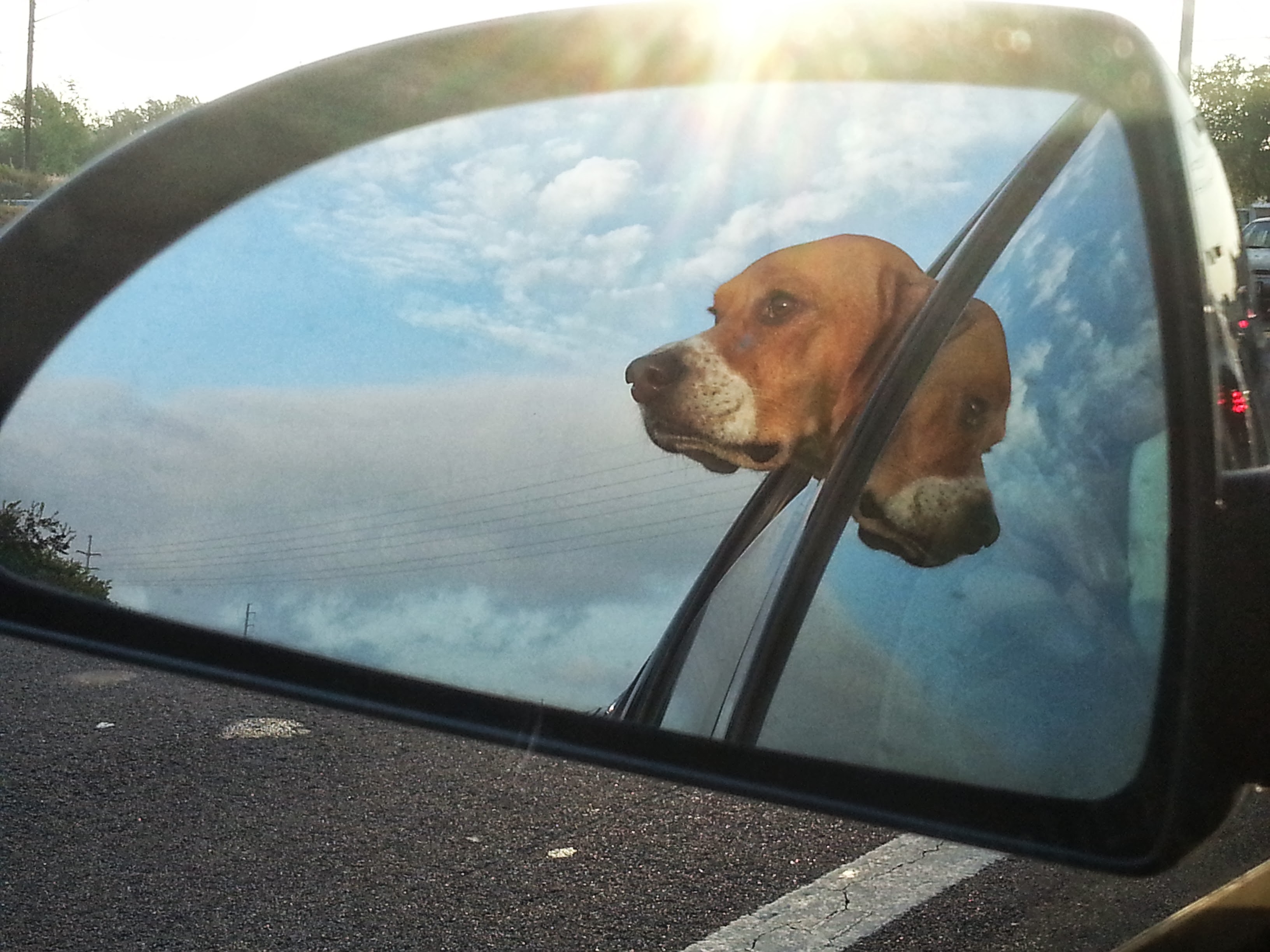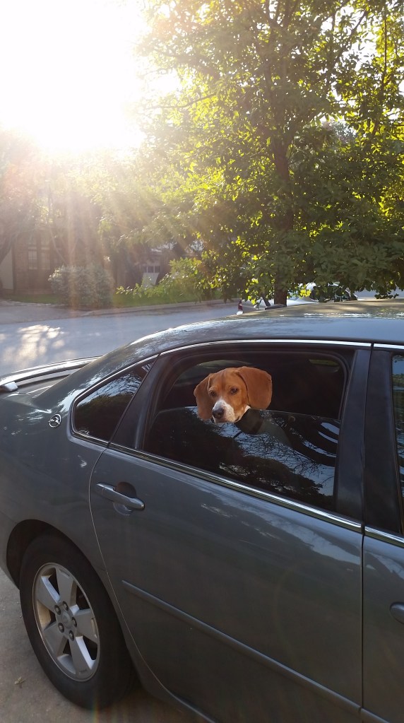 Another time, Baxter escaped without his collar on after a bath. Once I realized he was gone, I ran outside to the corner and started calling his name. Within a few seconds, a car drove down Amarillo Ave, and what should I see but Baxter riding in the backseat, tongue and ears happily flapping in the wind. I raced after it waving my arms and got them to stop. Amazing timing!