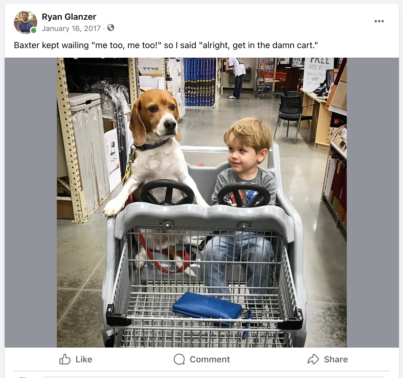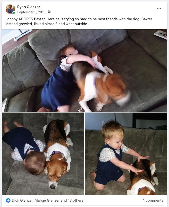 In 2014, baby John was born. And now that we had a real human baby, Baxter had to take a little bit of a backseat. And while we continued to give him some attention and affection, it wasn’t the same as before, and he was never really the same dog. Baxter was okay with kids, but he just didn’t take to them like he did me and Lauren. John never got to know the sort of dog who would fetch a ball or play tug-o-war. Looking back at the hundreds of photos from 2015-2017 or so, John sure did try. There are dozens of pictures of John trying so hard to coax that dog into playing, with Baxter literally looking the other way in disgust.