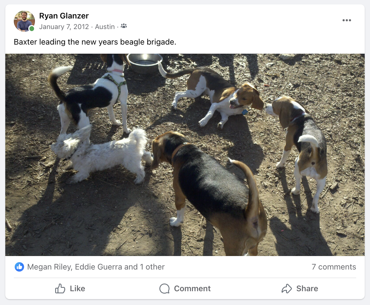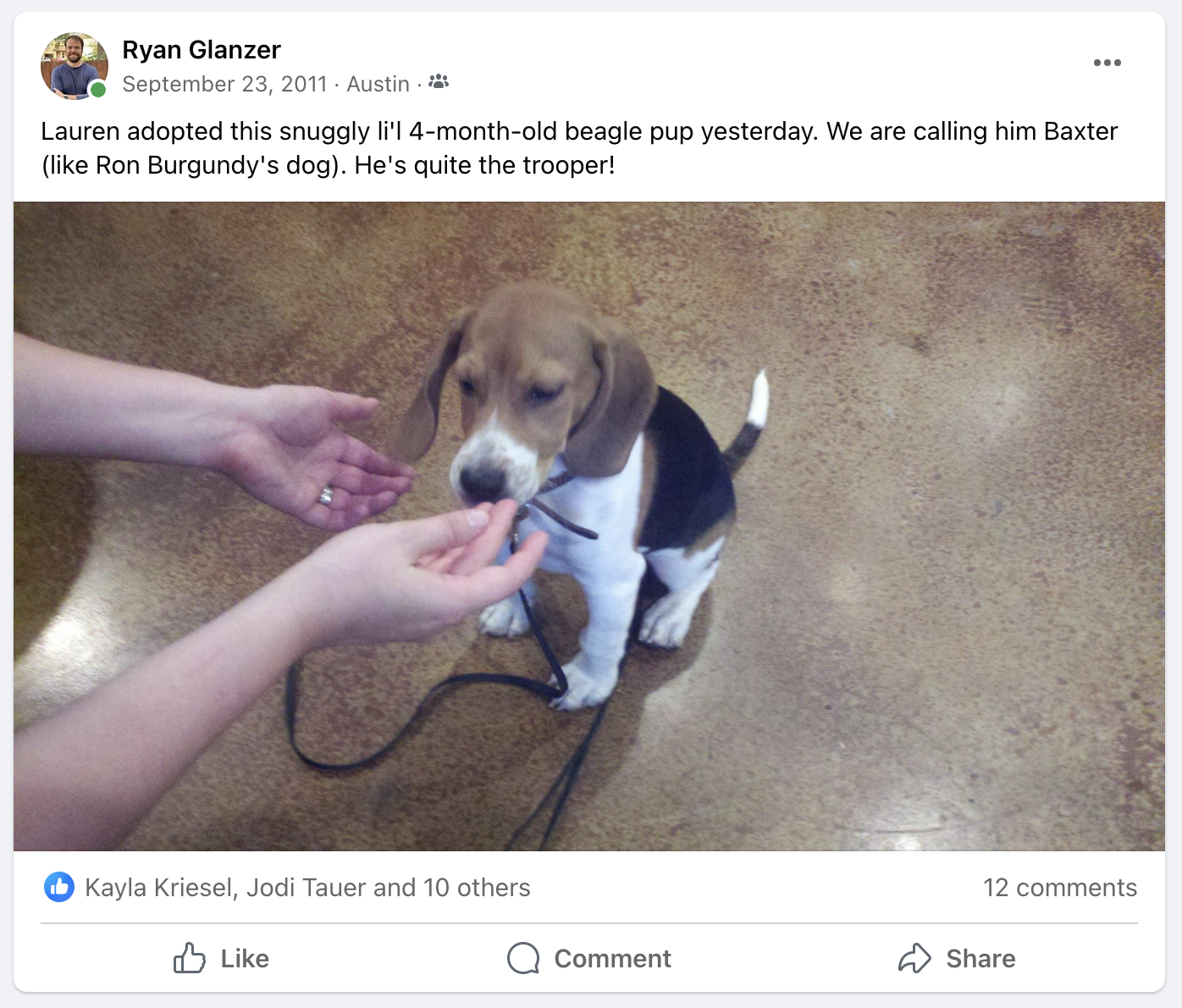 Baxter was said to be born on or around May 11, 2011 to a local mother beagle. He was quickly adopted by an Austinite named Francisco, or Frankie, I believe, and was named Dago—an Italian slur. After just a month or two, Frankie began to be troubled by his situation. The little ball of energy was too much for him and his apartment, and he listed Dago and his few precious belongings on Craigslist for the paltry sum of $200.