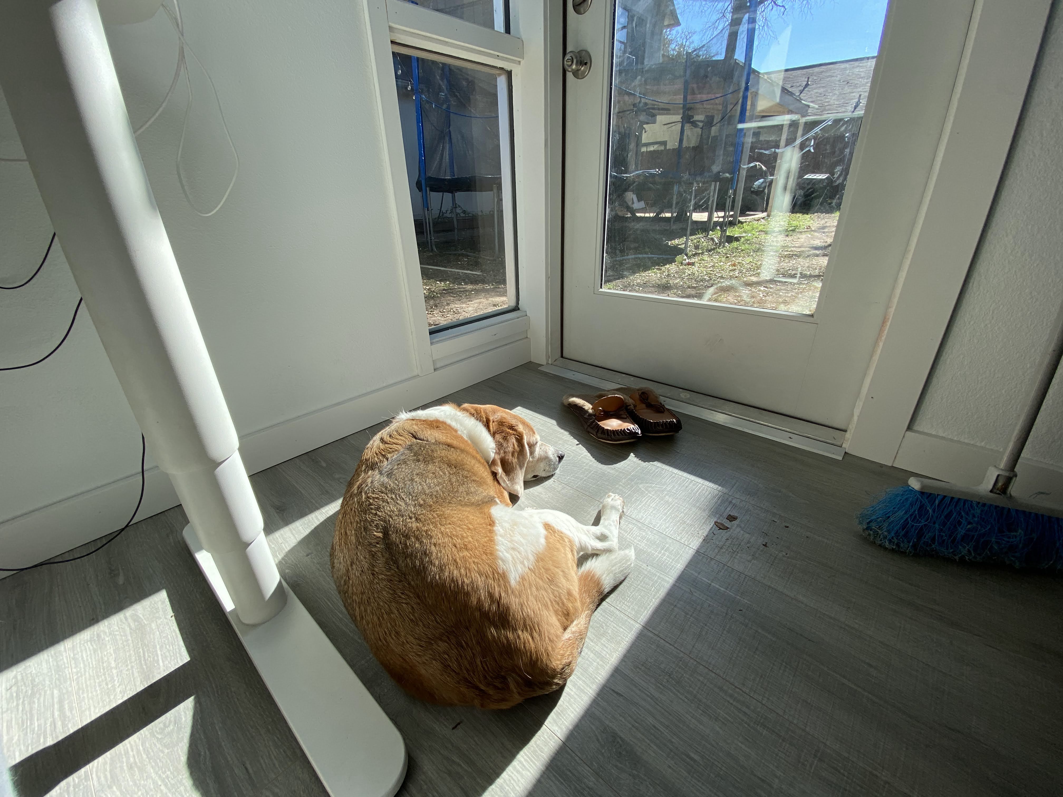 We recently hired a cleaning service, and Miss Eunice was set to arrive around noon for just her second cleaning. When everyone was getting ready for work and school, Lauren urged me to remember to lift Baxter out from under the covers (otherwise he’d literally stay there the entire day until the next bedtime) and take him outside so Eunice could change the blankets and make the bed. I headed out to the shed for a busy morning of meetings. Around 10:55, I had a small gap between meetings, so I went in and pulled Baxter out of bed. He yawned a big beagle yawn as I cradled him like a baby and carried him to the bottom of the steps, where I set him down. Noticing the time, I raced back out to the shed for my next in a long series of Zoom meetings.