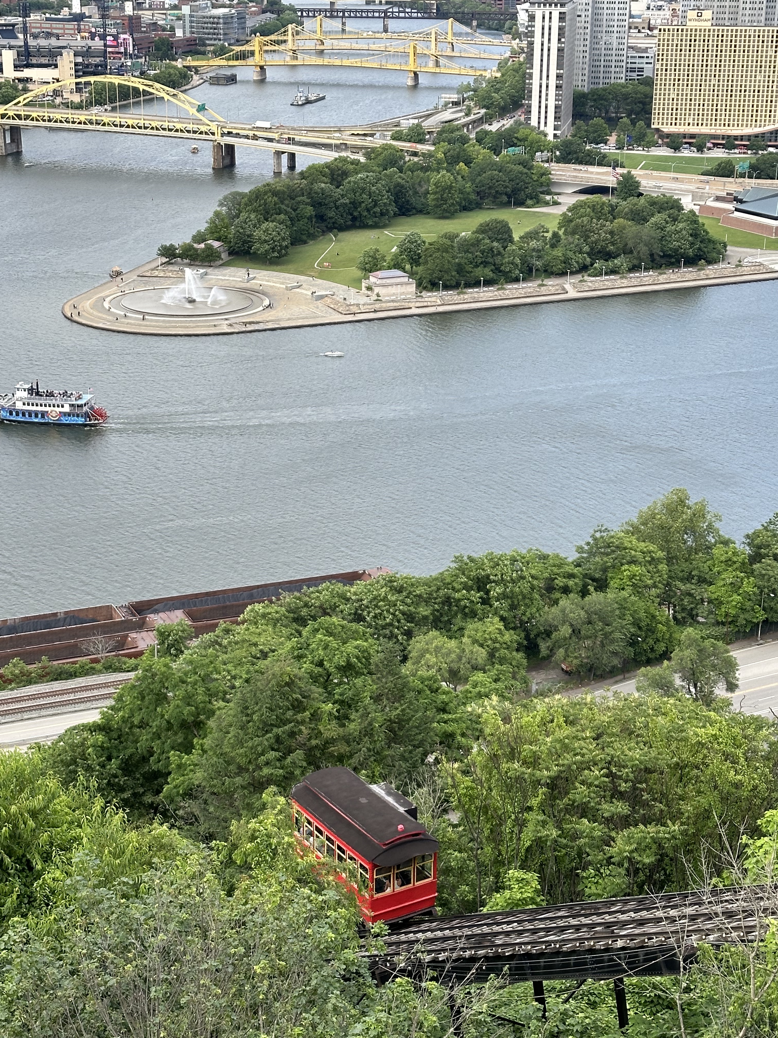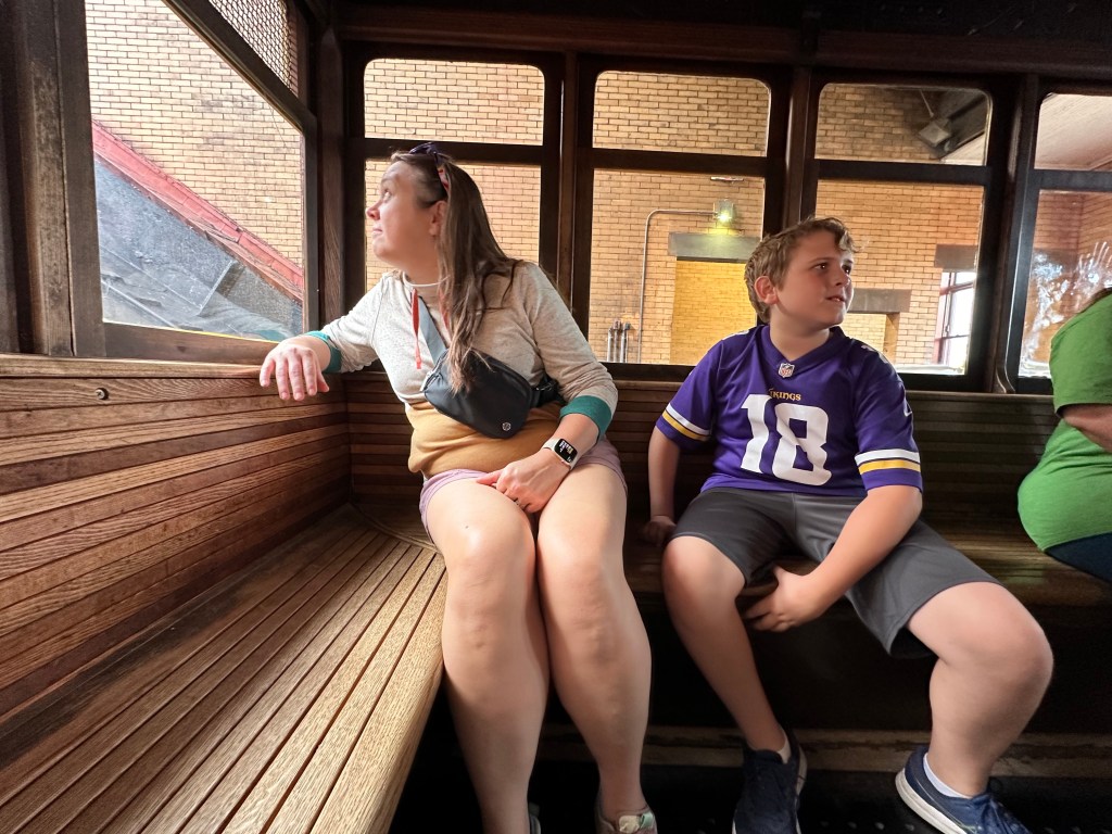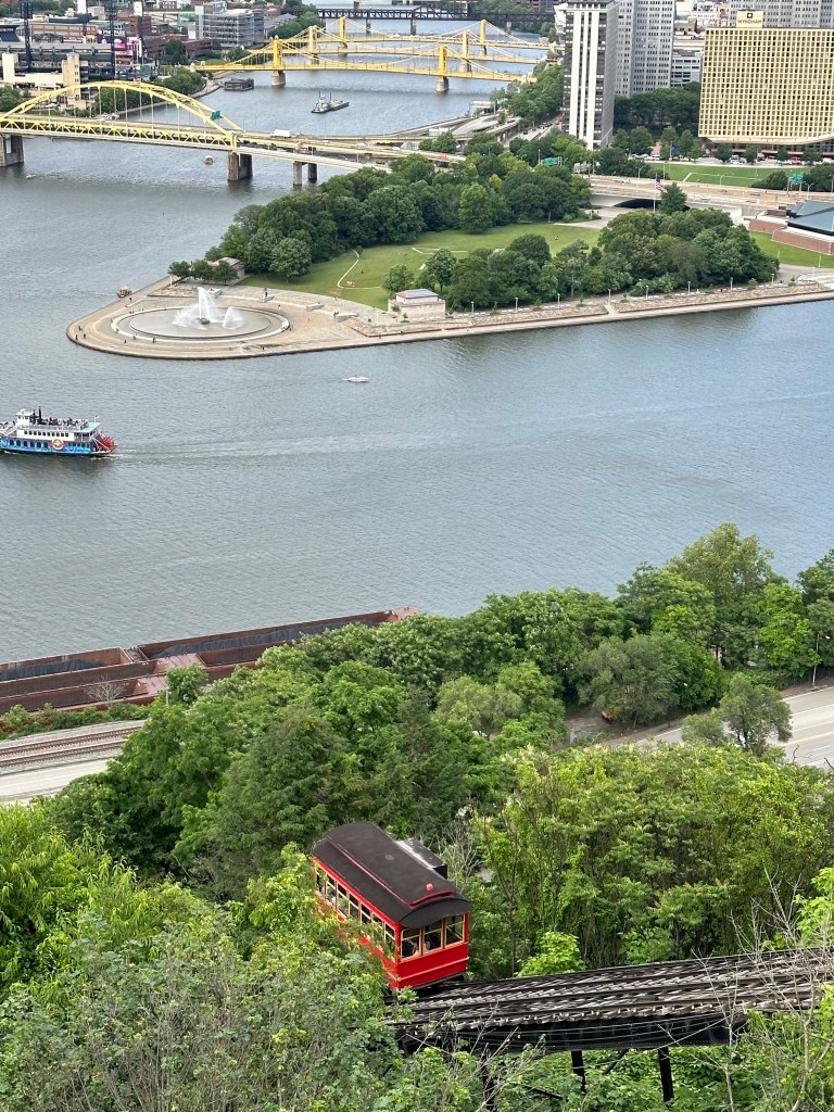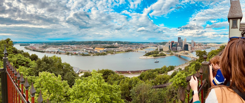It was time to head back to Pittsburgh. We dropped the rental car back off at the airport and Ubered into the city, where we checked into the hotel. While Lauren napped and the kids watched TV, I took the short 0.6-mile stroll down to PNC Park to look around and take in the atmosphere. It made me sad to be outside the bustling stadium with the Twins right there on the inside, but attending the Friday night game was not in our plans. We all walked to the famous Point State Park and saw the big fountain on the river. Then we walked over one of the many yellow bridges to the Duquesne Incline, a historic train car that sits on an angle and runs up a steep hill at a 45º angle. Built in 1877, it is still operational, mostly for tourists but I suppose still serves a practical purpose. We ended the night with dinner at a John-friendly restaurant, the Burgatory. Cheap flights, cheap hourly car rental, free park, $2 incline tickets, and relatively cheap dinner… a budget-friendly day!