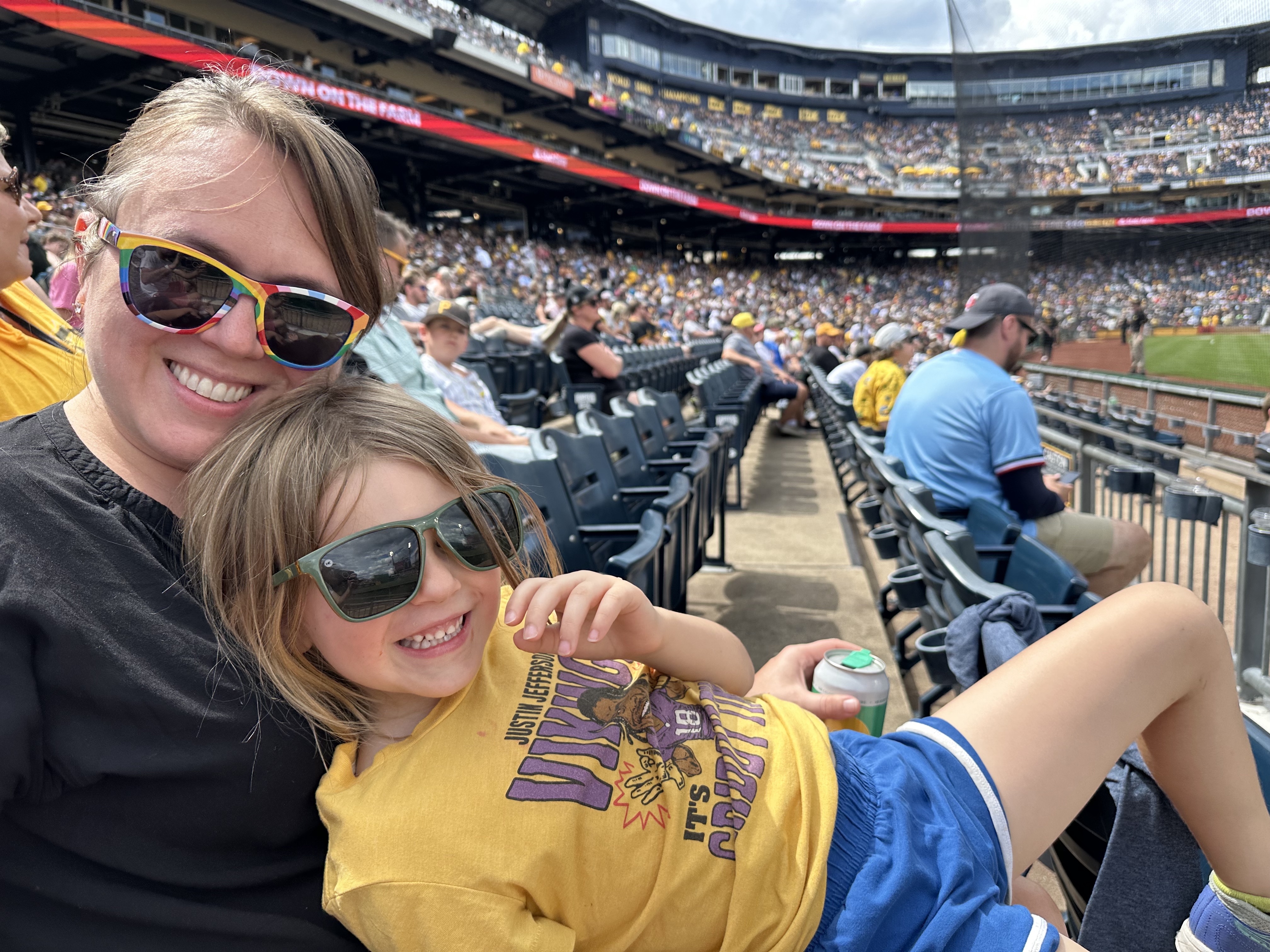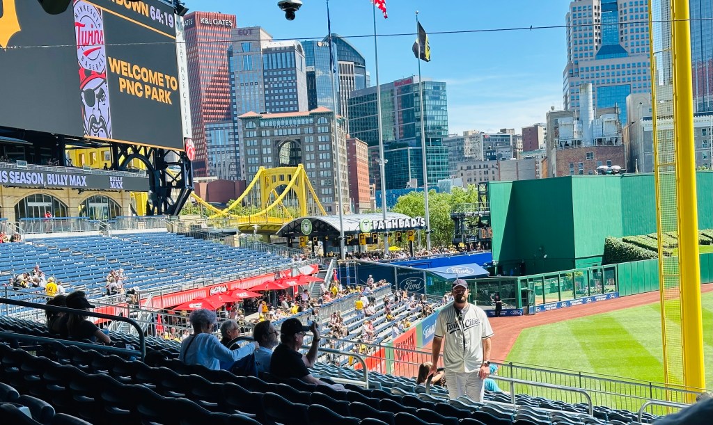 The gals went back to the hotel to take a load off while John and I walked over to PNC extra early for the Pirates-Twins game. It was an 80s t-shirt giveaway which attracted a lot of long lines, so we were far from the first in the ballpark. We had hoped to see Twins’ batting practice but they wrapped up early. John preferred to just sit in our seats and wait 90 minutes til the game started rather than wander around, so that’s mostly what we did. Our seats weren’t great, lower level but deep down the third base line in the corner under an overhang, but at least we were in the shade. Edie had fallen asleep in the hotel room and Lauren didn’t want to wake her, so they didn’t arrive til the 4th inning. The stadium lived up to the billing, the experience was fun, and quite a few $14 beers were consumed, but the Twins went down in defeat 4-0, their second straight shutout loss.