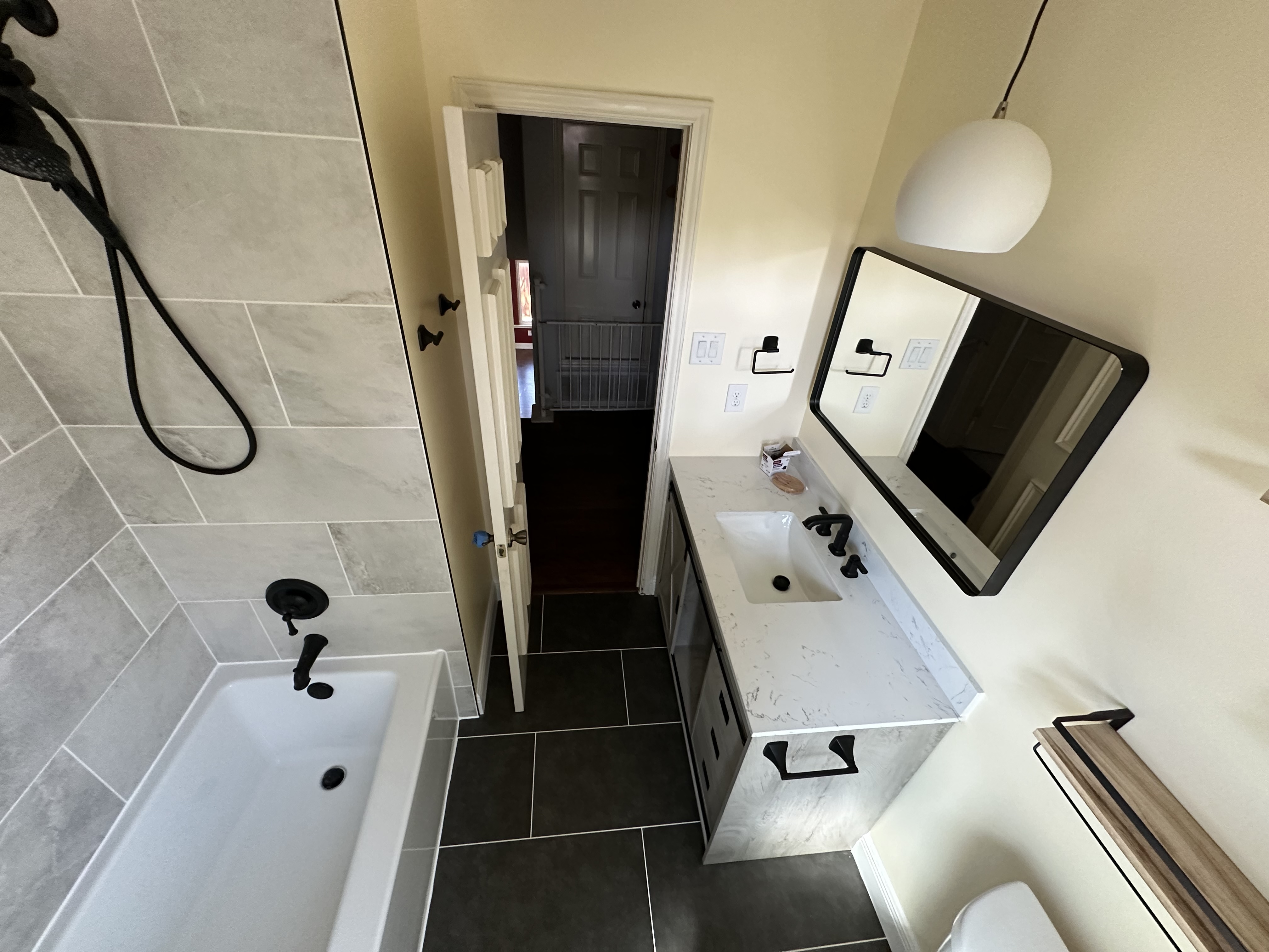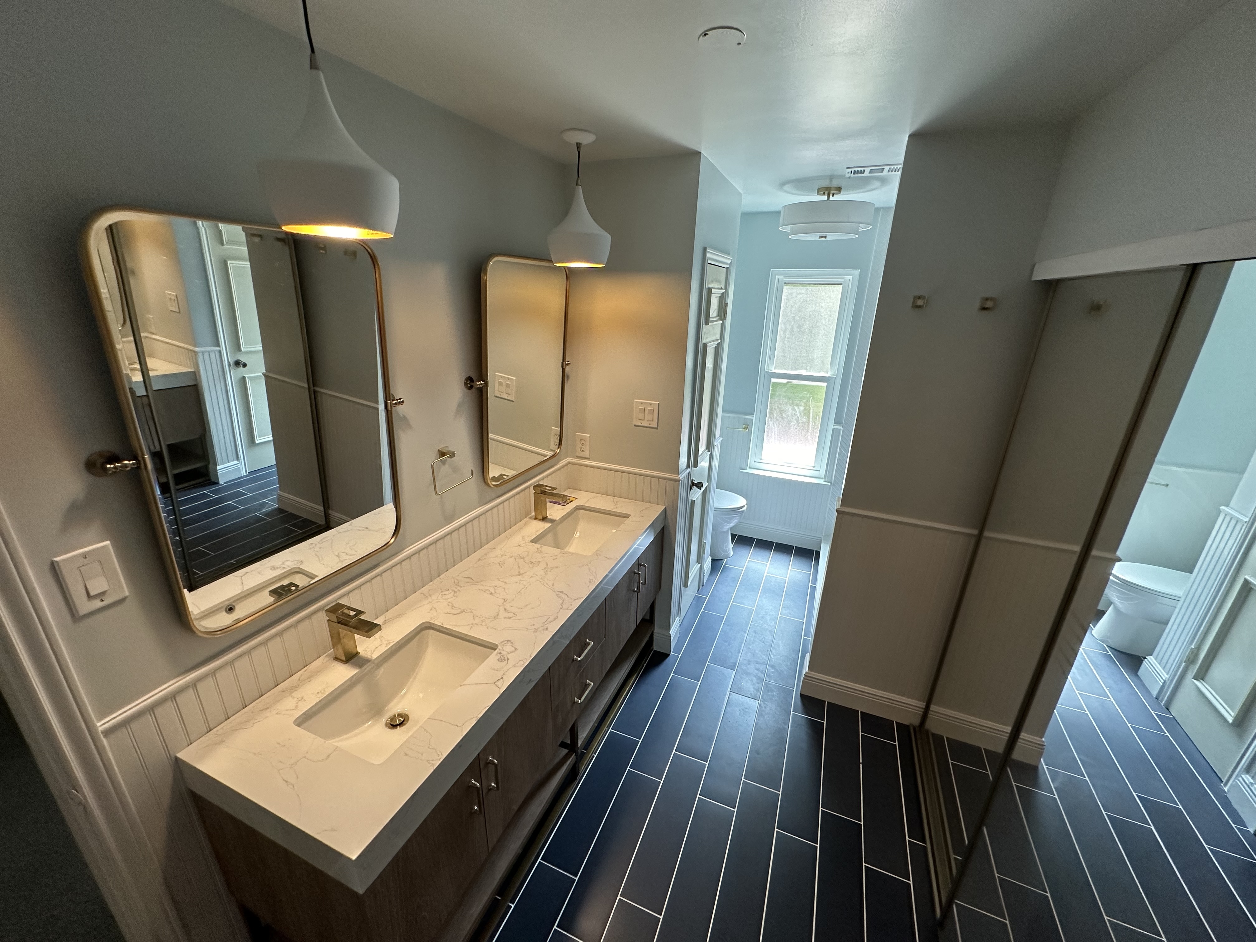 And now, it looks like this. The sliding closet doors are all that remain from the old bathroom, which again was fully gutted.