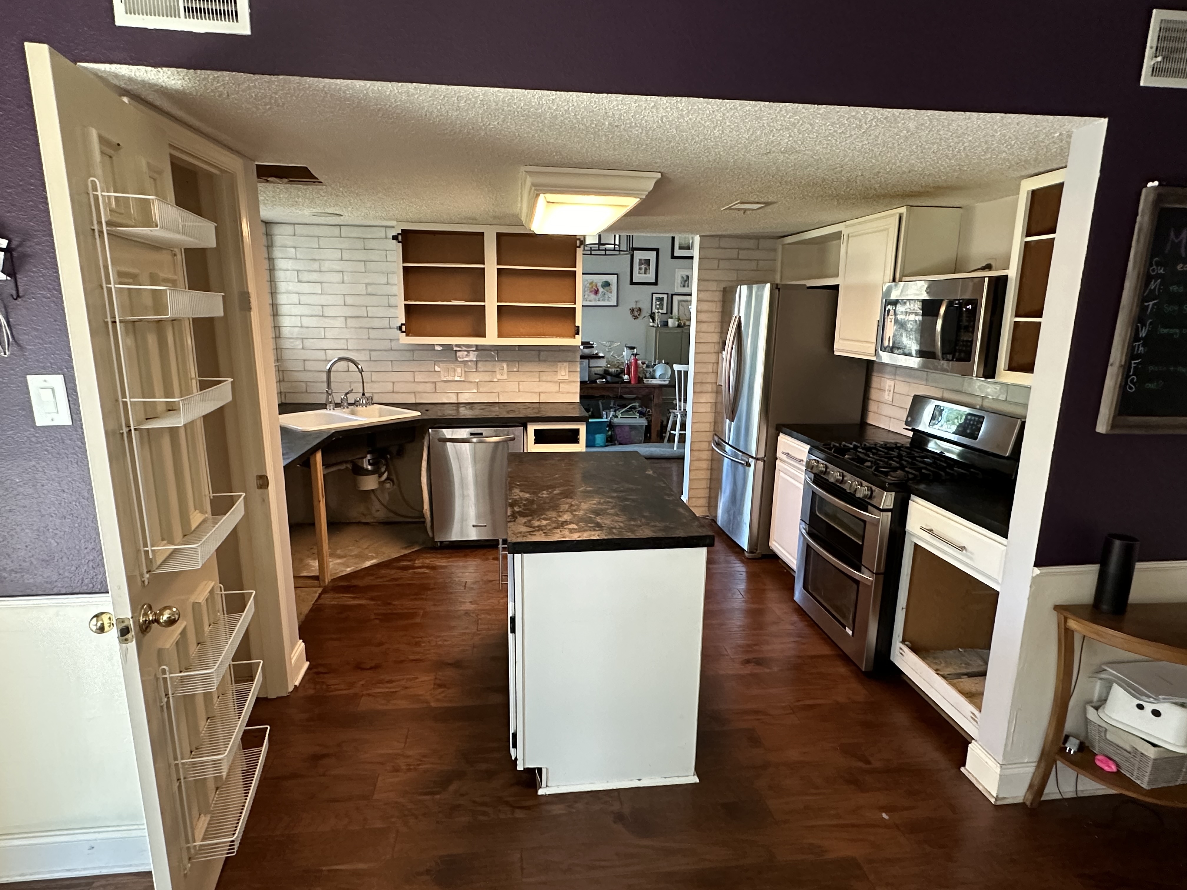 Here’s the before picture. You can see the old popcorn ceilings with dirty microwave stain. The literal hole in the ceiling. The missing cabinets under the sink from water damage that we never replaced. The countertops were made of MDF with some sort of lacquer over the top. The harsh fluorescent light in dropdown box which I would graze with my head was ugly. Yes, we installed hardwood flooring in 2015 and put in a backsplash in 2018, but it was still pretty rough.