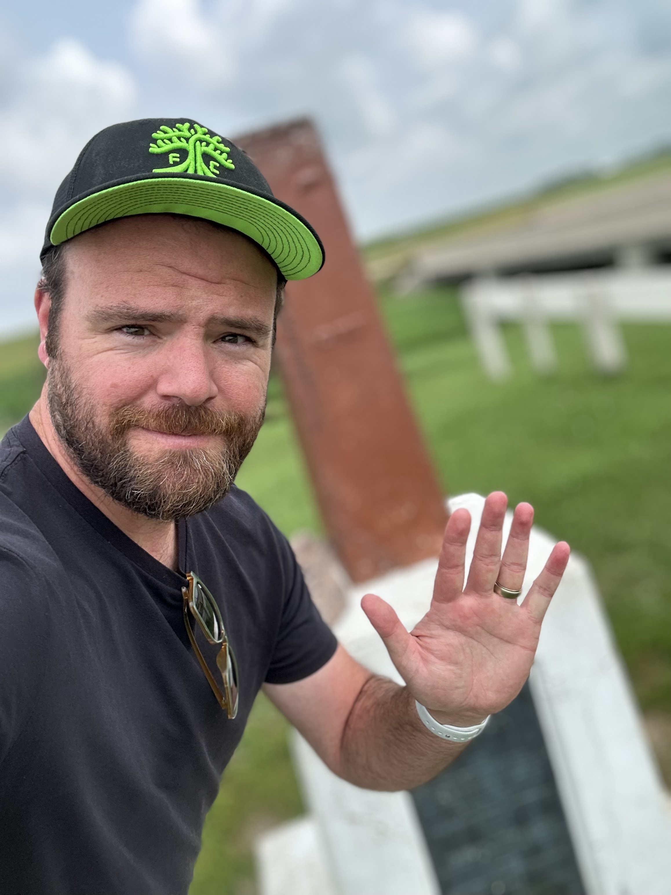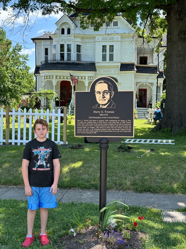 Our adventures took us northeast through Tulsa, where John chose MegaStuff Oreos at a gas station for a snack. Very shortly thereafter I had to pull over for him to puke on the side of the road. Not long after that, we pulled over again in Miami, OK for Edie to change her pee-pee pants. Less than a mile off the interstate was a tri-state marker for OK-KS-MO. It was a no-brainer to pull over and check it out! Much like an annoyed John at the FL-AL border in 2021, Edie stayed in the car while the rest of us stood in three different states at once.