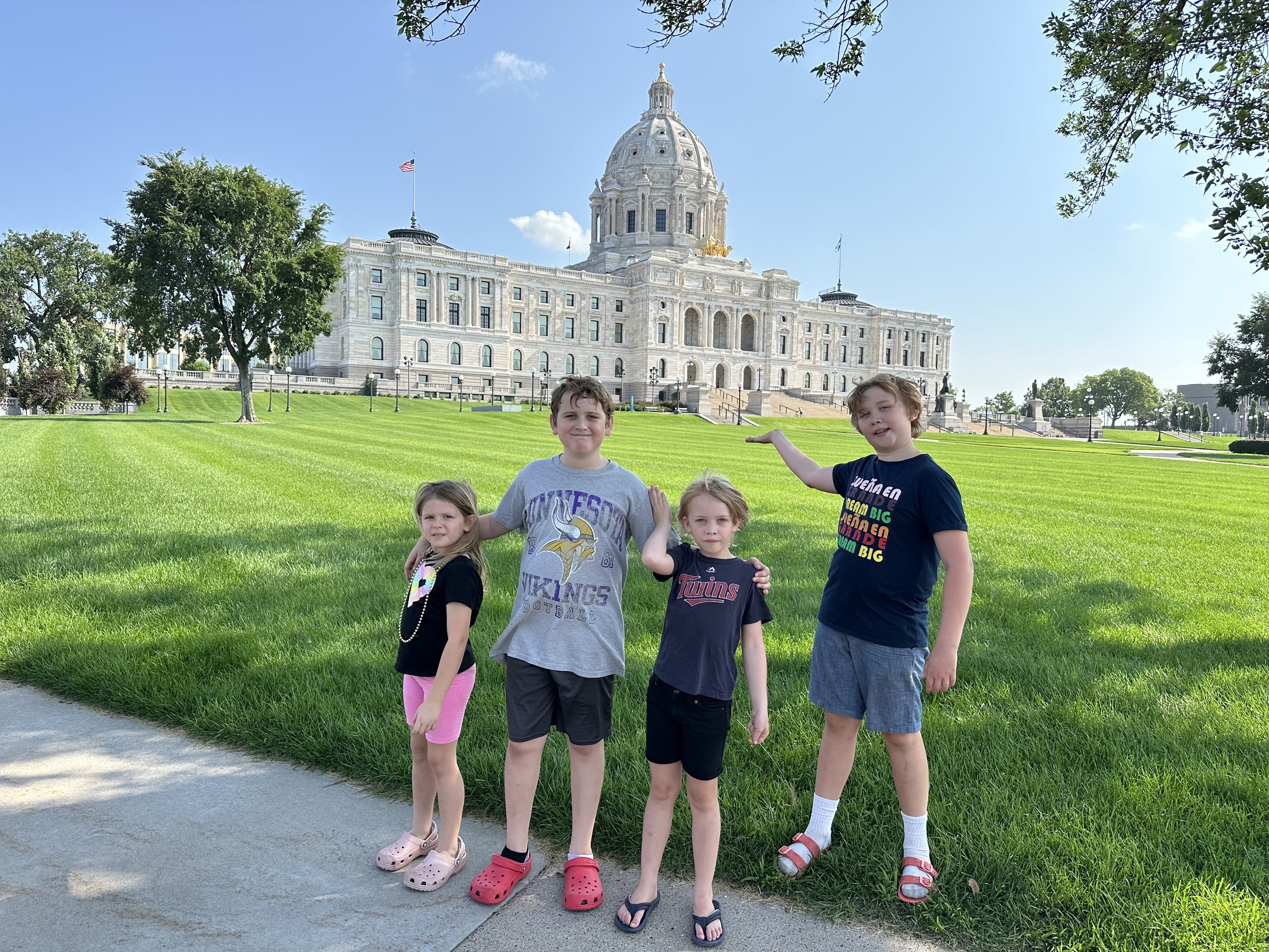 I took Friday off work to relieve all the babysitters and take on the kids myself. John, Edie, Teddy and Julia piled in the van for a day of Twin Cities fun with Uncle Ryan. We got donuts, went to a sculpture park/playground, toured the Minnesota state capitol, paddle-boated on Lake Como, had lunch at St. Paul Brewery, and finished the day with a trip to the Vikings Museum at their training facility in Eagan. What a day! That night the entire extended Poulter family gathered at Anne’s for dinner.