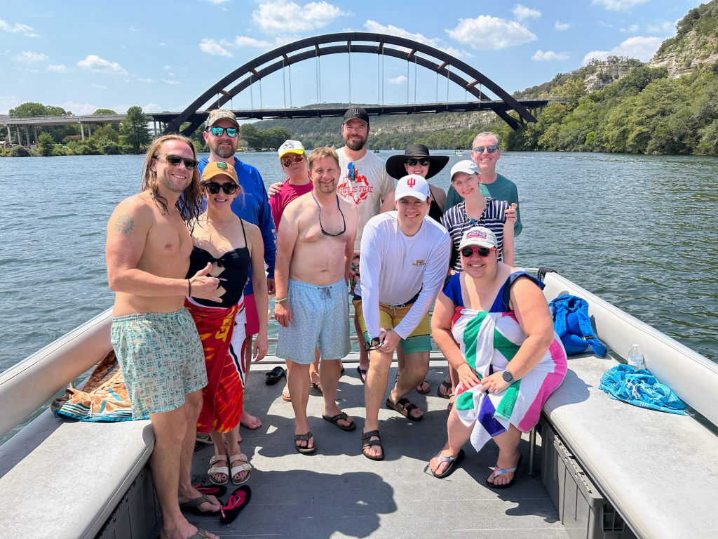 Anyway, Lauren went to great efforts to rent a double-decker party boat to take friends out onto Lake Austin on the 23rd. With the kids in school, we had a built-in sitter for the day. It was a big ask for friends to take time off work and hang out with us in my honor that day, but quite a few did! The Megos were there, with Brian sharing the birthday honors. The Marrs, Plumpes, and one each of the Wilkersons, Glaesers, Silvas and Heards were the other guests. The boat buzzed us around the lake for a bit before docking at “party cove” with some other boats, and we swam and frolicked in the warm water over the course of four hours that flew by. Good times!