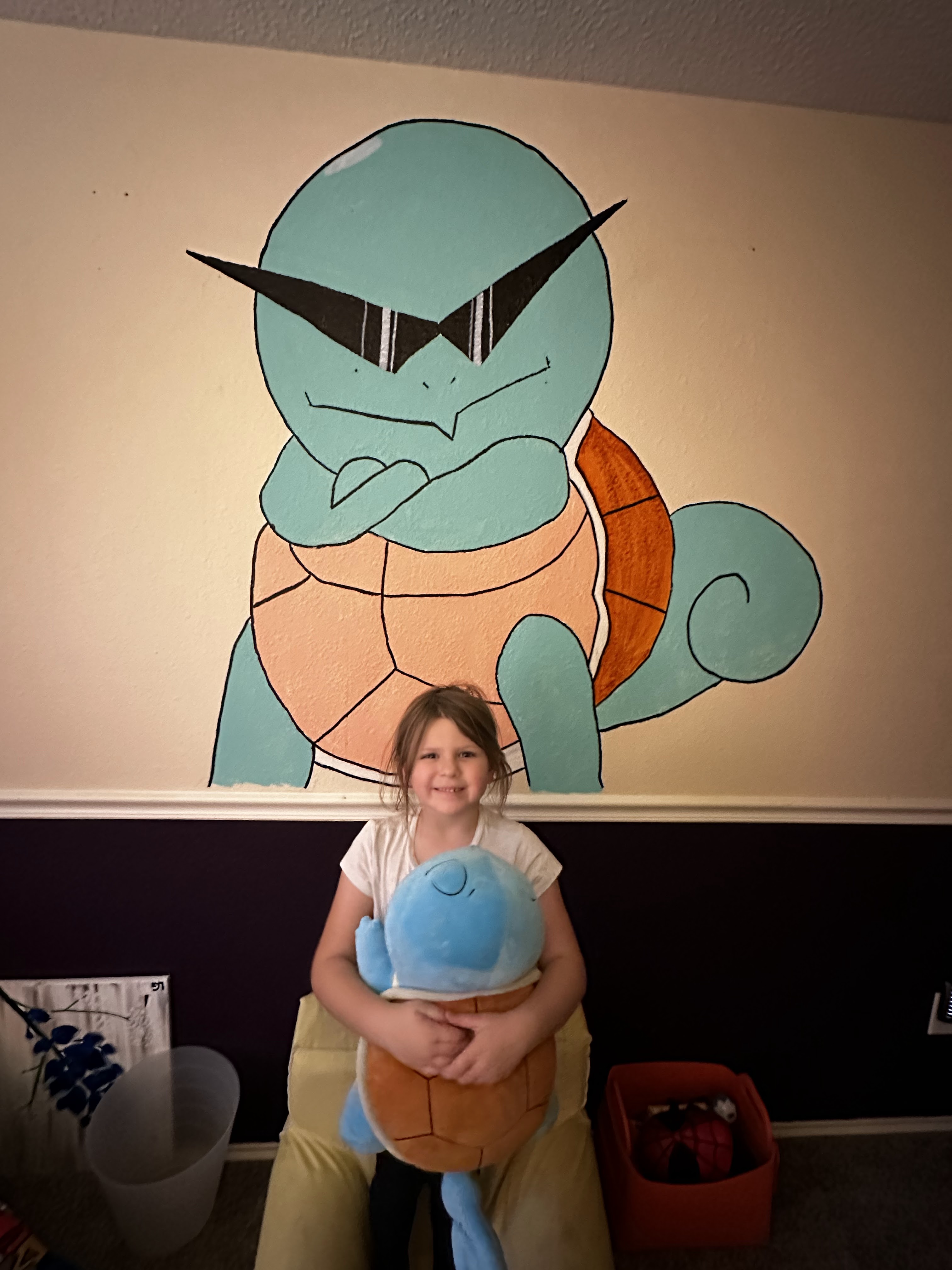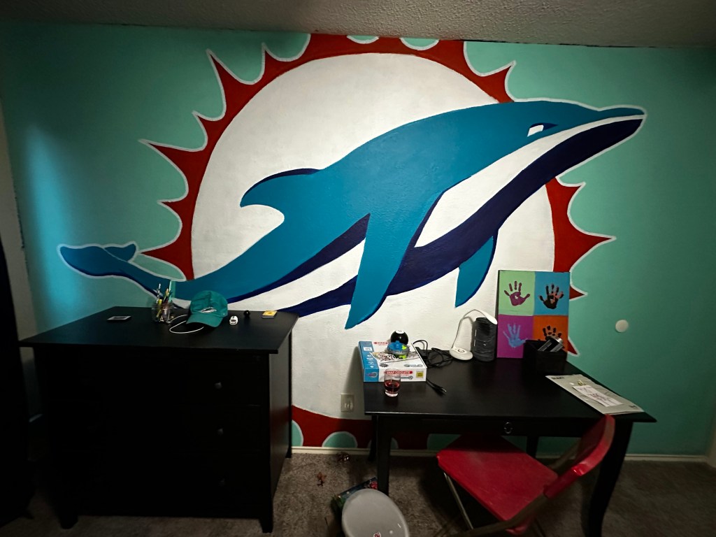 The kids finally decided to split up and stop sharing a single bedroom, a wise decision for a near-middle school boy and a kindergarten girl. The move forced Lauren out of her office and banished to a less private space in the kitchen area—not ideal for all her calls. Edie got a new “trundle” bed, which means a secondary mattress can slide out from under her bed. John has slept in there a couple times so far. Since the kids didn’t get many Christmas presents with us pouring our funds into a Mexico vacation, I said I’d paint a mural of their choosing on their walls. I gotta say, the large-scale Dolphins logo turned out great, but these are going to be a bitch to cover up when it’s time to sell and move out someday! Wallpaper, maybe.