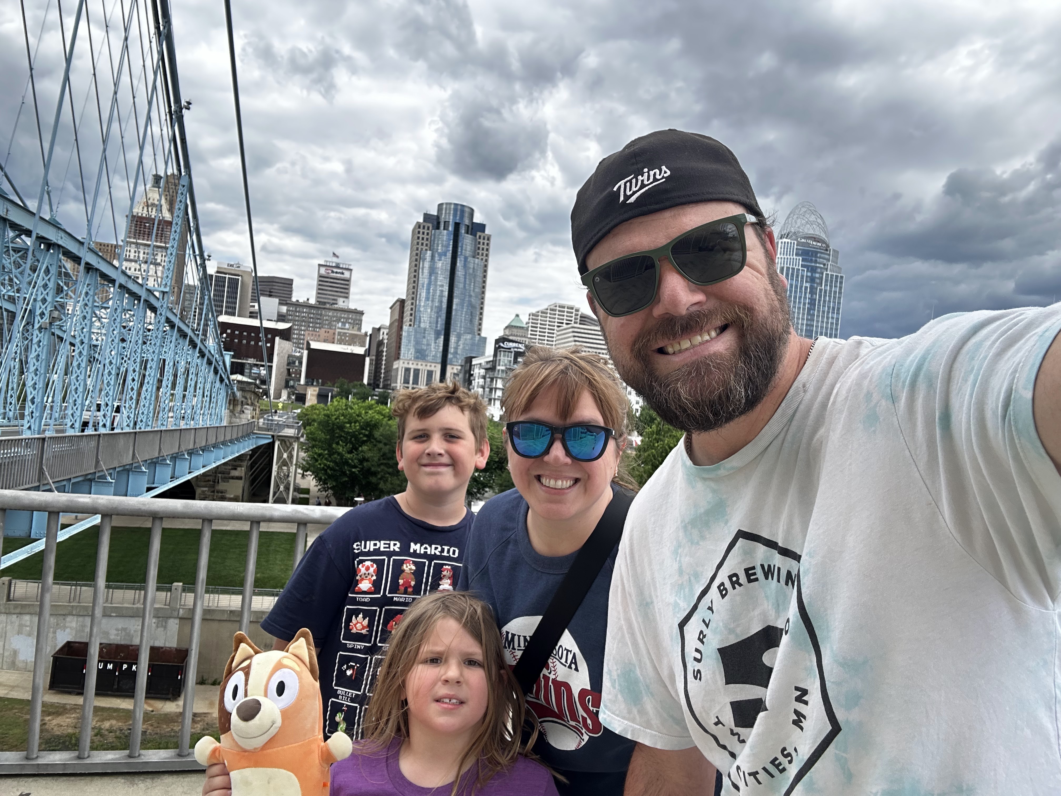 We flew Allegiant because it is cheap (about $100 per person one-way) and it was one of two possible direct routes. After landing at the Cincinnati/Northern Kentucky airport, we were able to check into our hotel early. We had a free hotel room too thanks to all Lauren’s Hilton points from her WF days. We ate lunch at Nicholson’s Fine Food & Whiskey and then walked down to the riverwalk, where we posed for a picture on the bridge separating Ohio and Kentucky. At night, John and I went to the Reds vs. Cubs game while Lauren and Edie stayed in, tired from a long day of travel. We sat down the right field line in the corner by the foul pole. As you likely heard on The Facebook, John caught a ball thrown into the crowd by a bullpen catcher who had been playing catch with Cubs right fielder Seiya Suzuki. I was just in shock, because John is 10 and had now gotten 8 balls at major league games in his young life, while many adults I know have never once gotten one in hundreds of games.